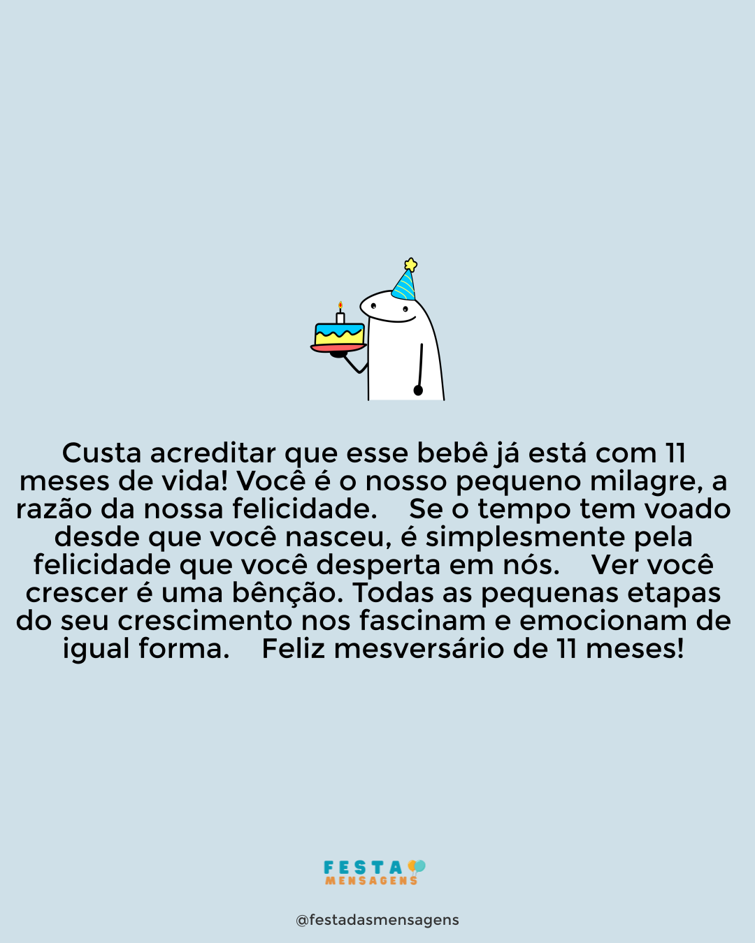 Que hoje você possa desfrutar de toda a alegria de completar 12 anos. Espero que possa passar este dia ao lado de todas as pessoas que mais gosta. Aproveite a companhia dos seus amigos, desfrute dos abraços apertados dos seus familiares. Nunca perca este seu jeito de sorrir, que é tão sincero e bonito de ver. Você é uma criança muito especial e fico feliz em fazer parte deste momento de celebração. Saiba que sua família tem muito orgulho de você e estão todos contentes em poder comemorar este dia ao seu lado. Que seu novo ano seja alegre e feliz como você! Parabéns!