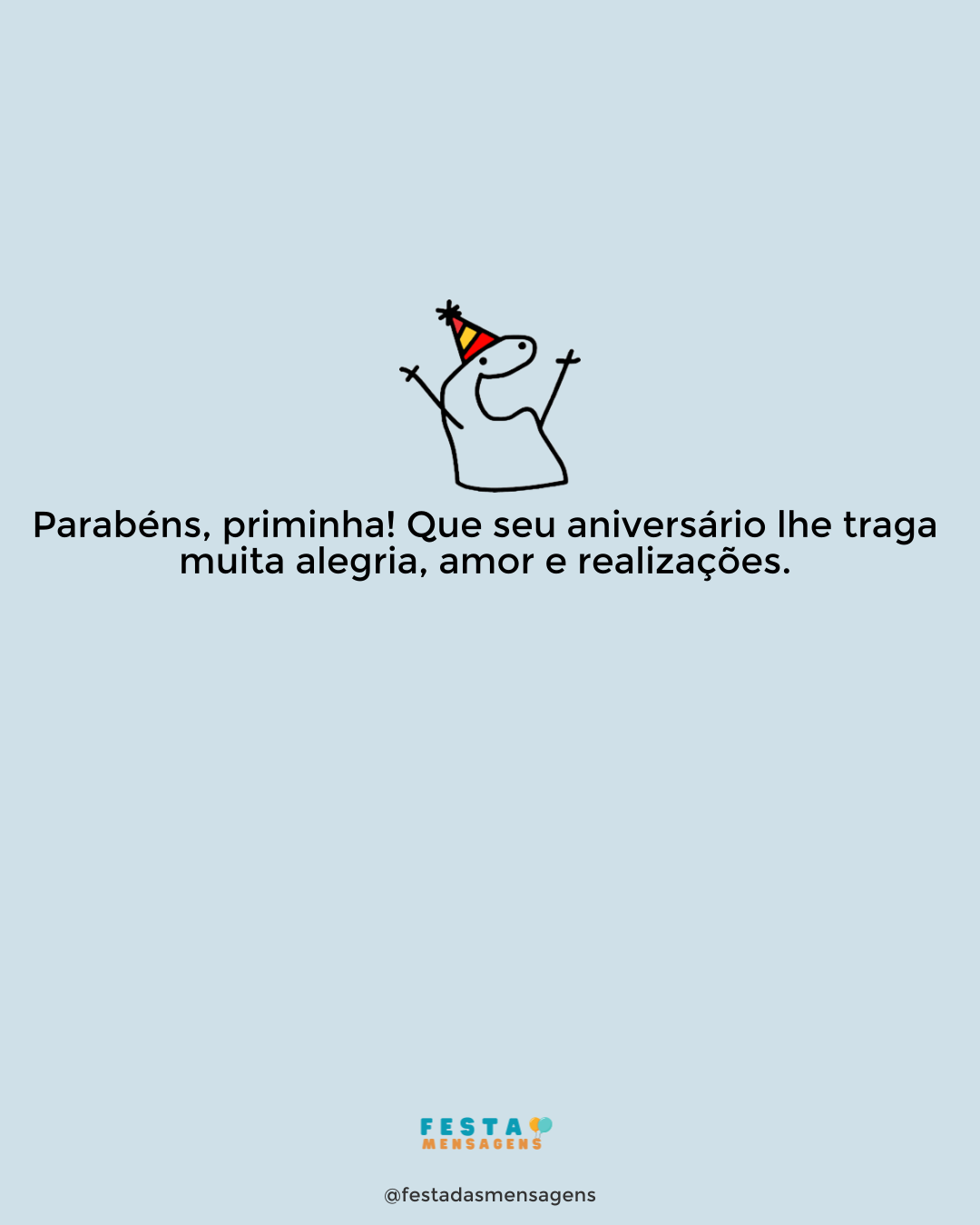 Que loucura, a prima mais doida do universo está completando mais um ano de vida e isso só pode significar uma coisa: uma dia inteiro de festa! Parabéns, prima! Você é uma das pessoas mais divertidas que eu conheço e tenho muita sorte em ter você na família e poder chamá-la de prima. Espero que aproveite cada segundo do seu dia e não perca nunca este sorriso lindo que sempre vejo no seu rosto. Feliz aniversário, prima!