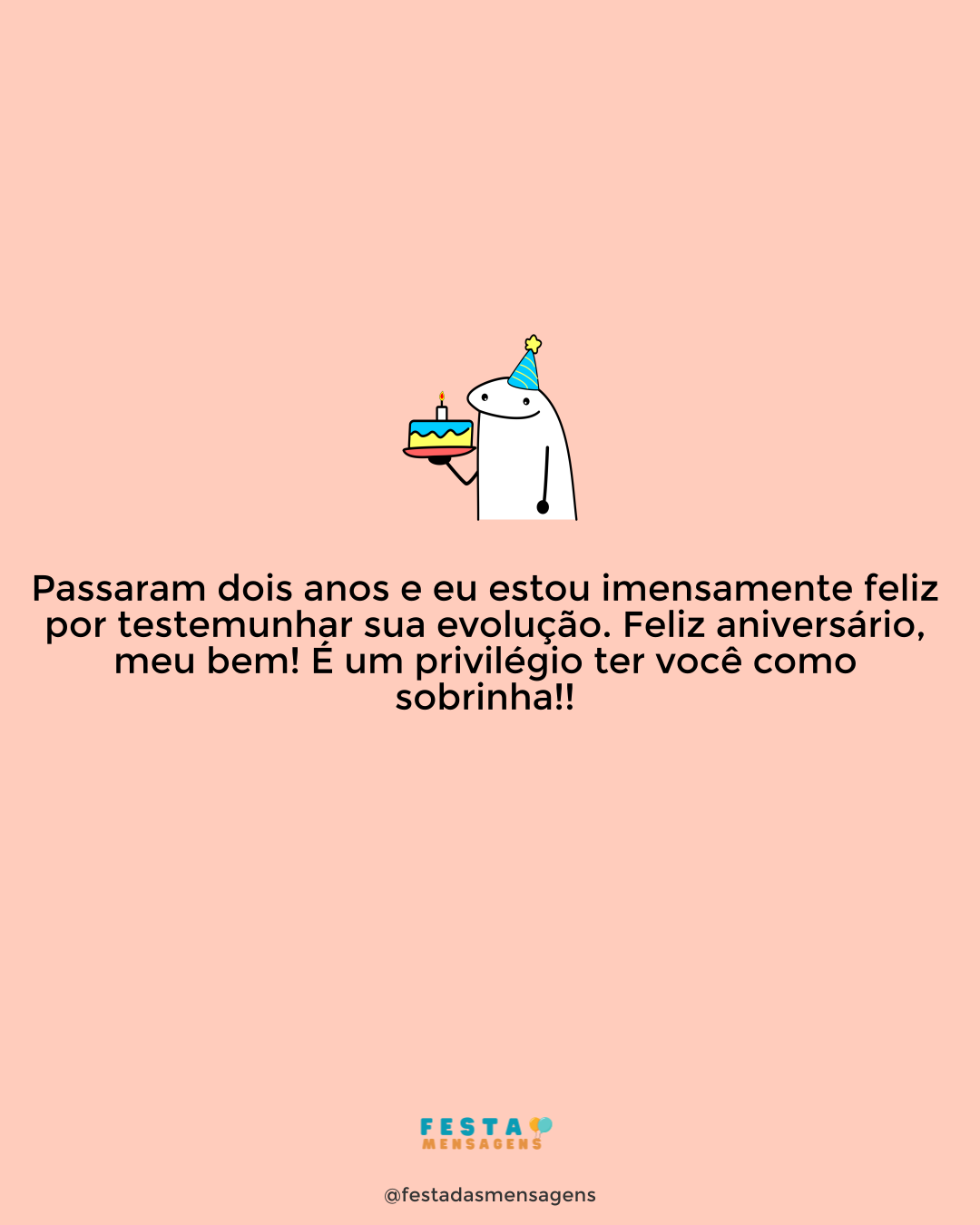 Hoje é o seu dia, sobrinho, e me corta o coração saber que vamos passar esta data sem que eu possa lhe dar um grande abraço e desejar tudo que gostaria pessoalmente. Ainda assim, saiba que eu fico muito contente por você e lhe desejo muitíssimas felicidades. Vejo que você está cada vez mais perto de se transformar na pessoa que eu sempre soube que você se tornaria e isso me traz uma grande alegria e um sentimento profundo de orgulho de você. Meu sobrinho, mesmo longe eu tenho você no coração e lhe desejo sempre o melhor que a vida pode oferecer. Parabéns pelo seu dia!
