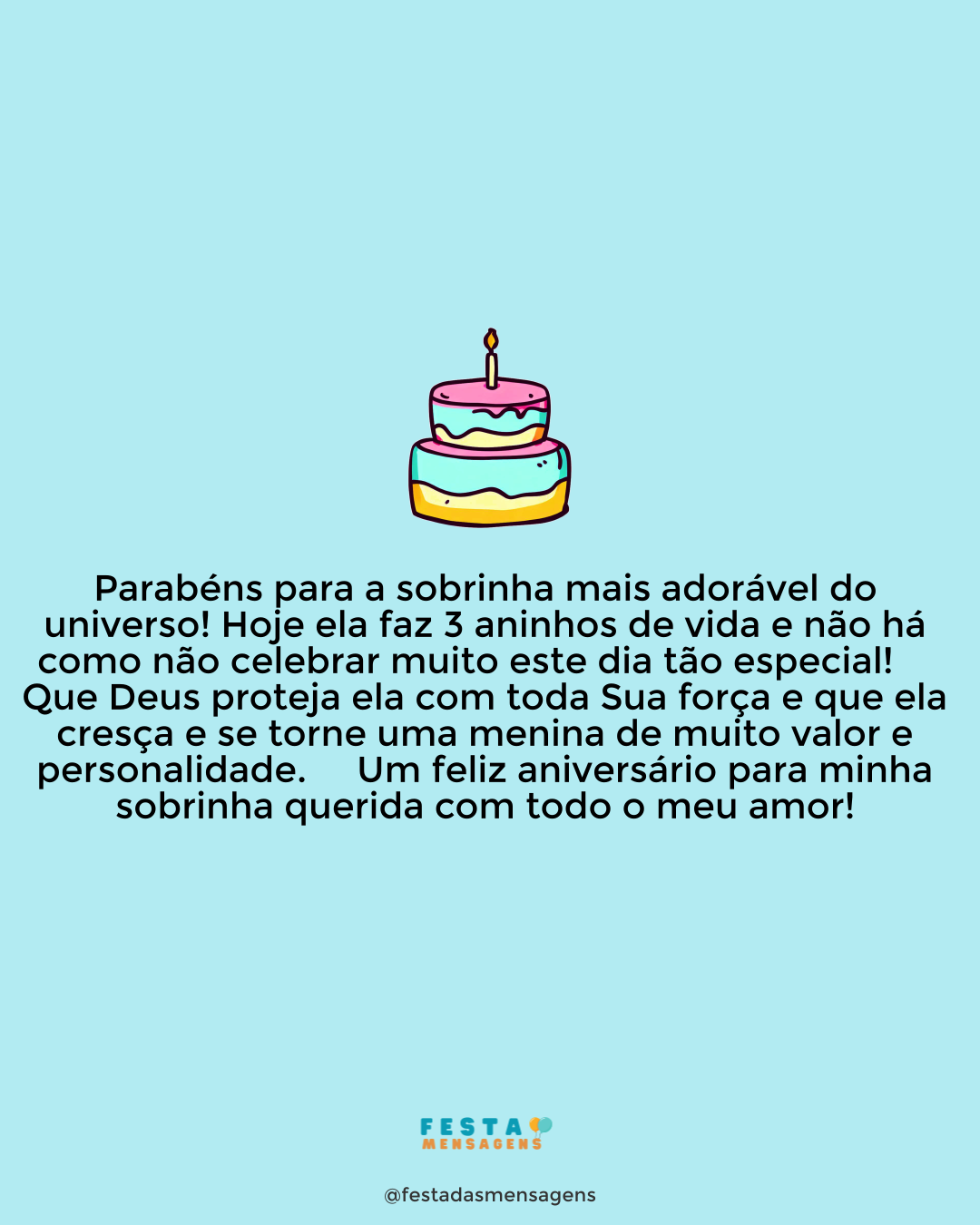 Você é uma menina especial demais, um doce de criança e a sobrinha neta que eu pedi a Deus. Que possa aproveitar o seu aniversário ao lado dos amigos. Saiba que eu adoro você e, sempre que puder, estarei ao seu lado. Você está crescendo rápido e é muita emoção acompanhar seus passos. Celebre este dia com toda a alegria do mundo. Feliz aniversário!