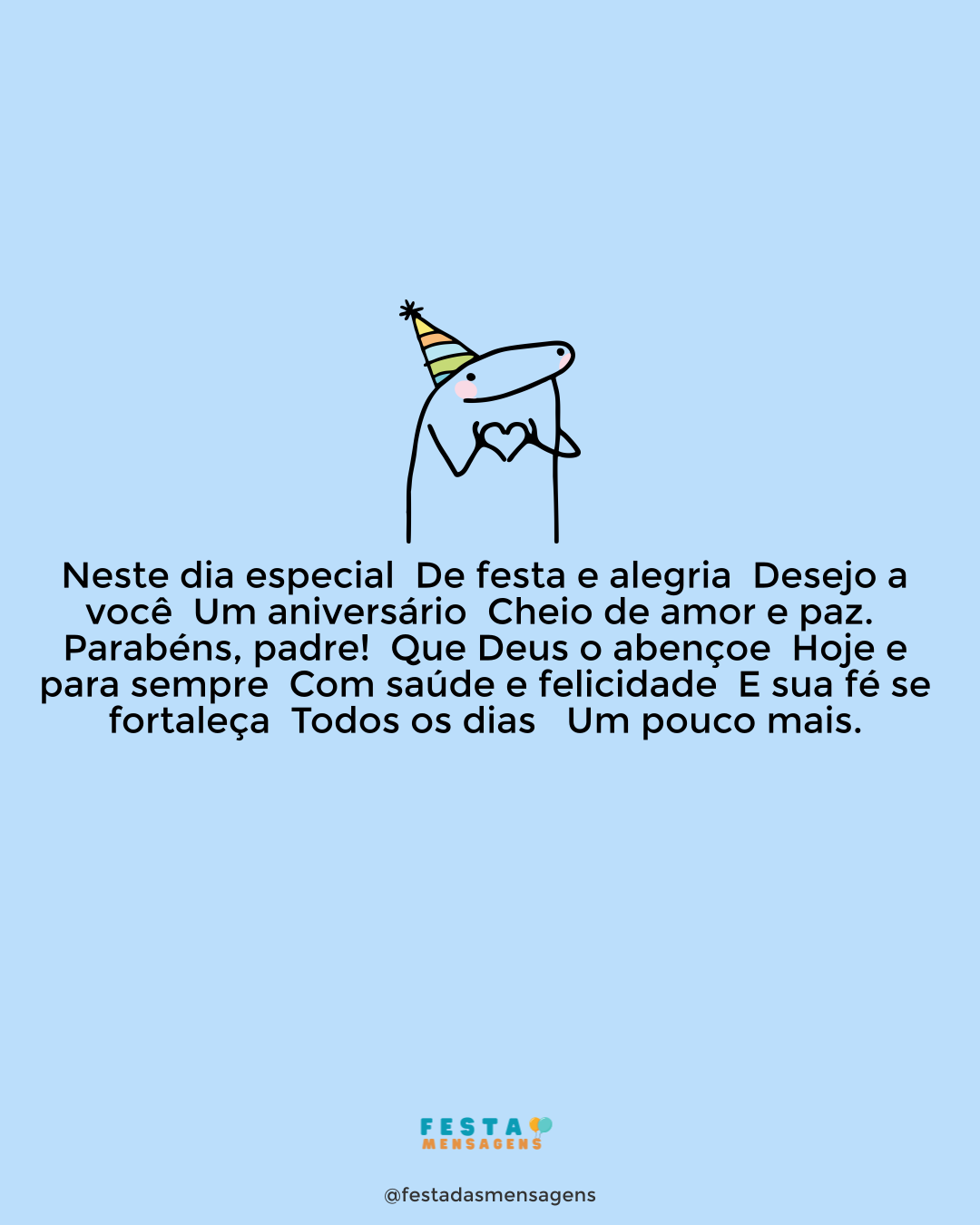 Neste dia de festa e alegria Receba meus votos de feliz aniversário! Que seu coração seja inundado Por muito carinho e amor. Que sua vida seja sempre feliz E nunca falte paz, saúde e sucesso. Parabéns e muitas felicidades!