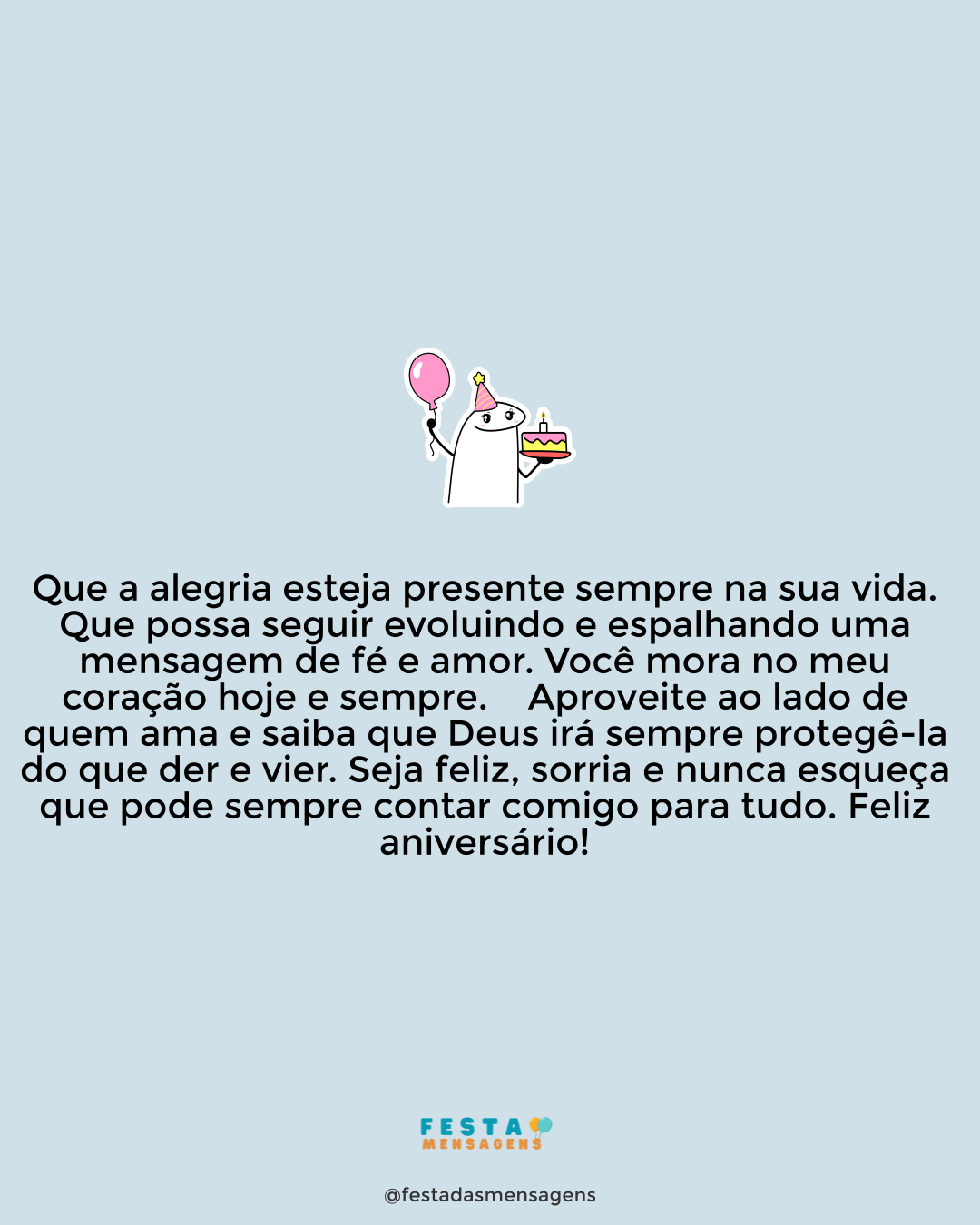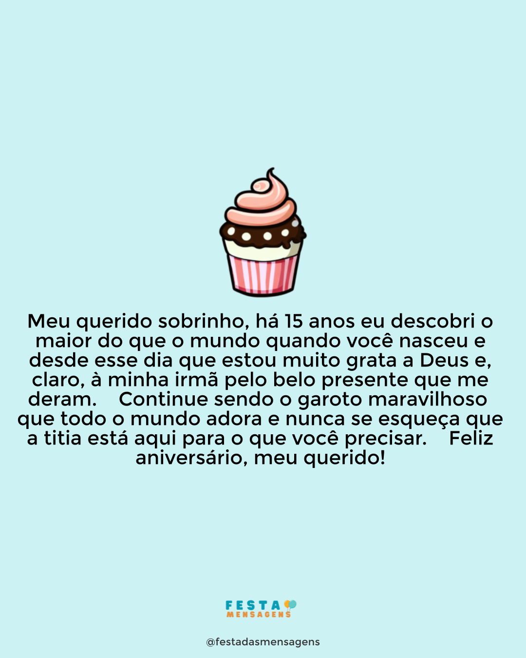 Feliz Aniversário, minha querida debutante! Hoje é um dia especialmente importante para todos nós, e principalmente para você. A vida é a coisa mais valiosa que você pode ter, por isso comemorar sua existência é um marco obrigatório de celebrar. Agora que você está entrando numa nova fase de sua vida, se divirta muito hoje porque novas responsabilidades e desafios estão no aguardo. Tenho muito orgulho em ter você em meu coração. Não importa você não ser minha filha, porque é dessa forma que vejo você: minha filha, minha amiga para a vida! Não me interessa como você me chama, acredite que isso não tem relevância para mim. Só quero sentir que nossa ligação é forte, constante e eterna. O resto são coisas inúteis! Na verdade, o mais importante hoje é que você encontre o rosto da alegria, da paz e da felicidade no espelho. É lá que ele tem de morar a toda a hora. É no espelho que reside a honestidade de seu coração, por isso continue fazendo seu trilho com a mesma humildade que tem feito de você uma menina deslumbrante. Feliz Aniversário!