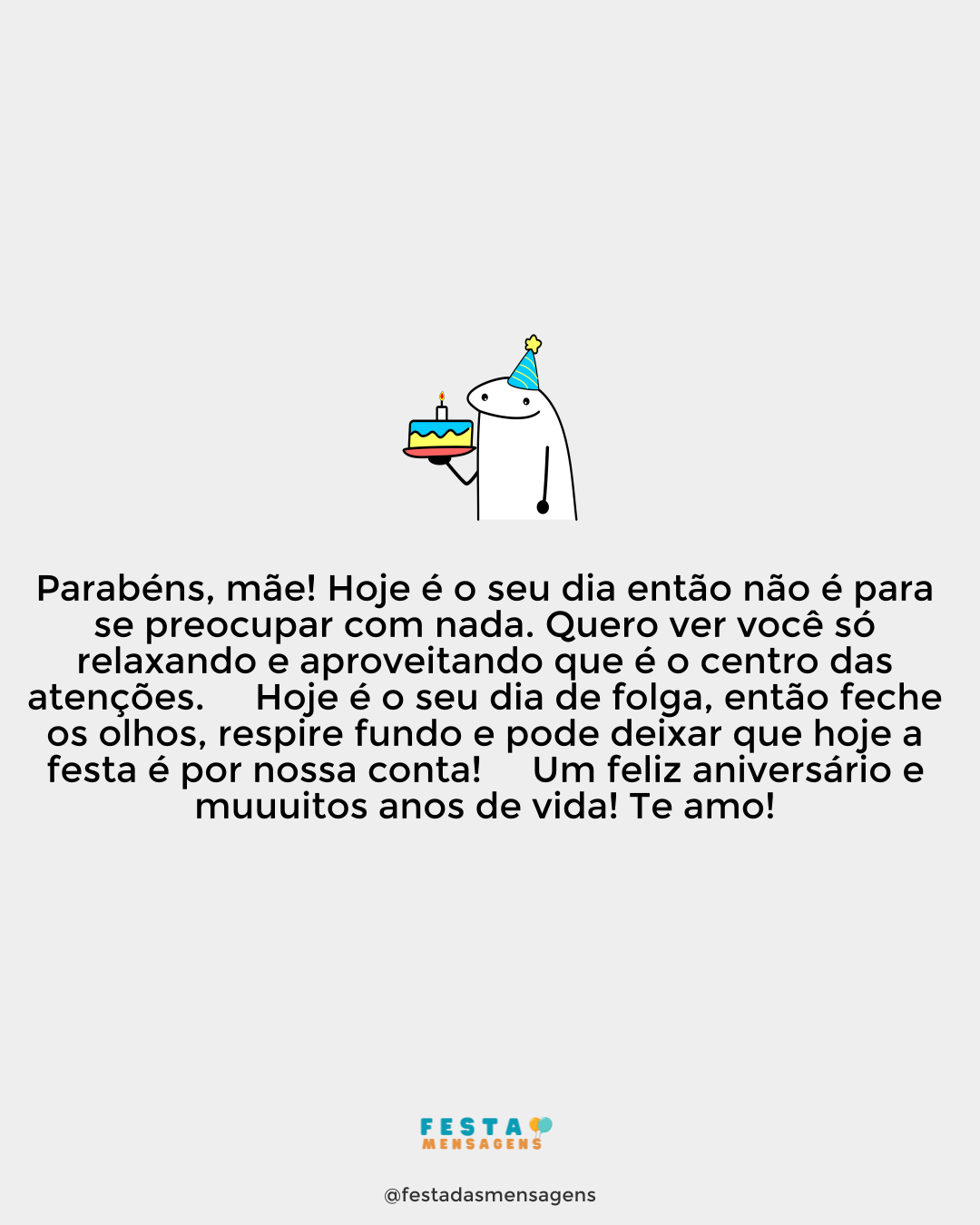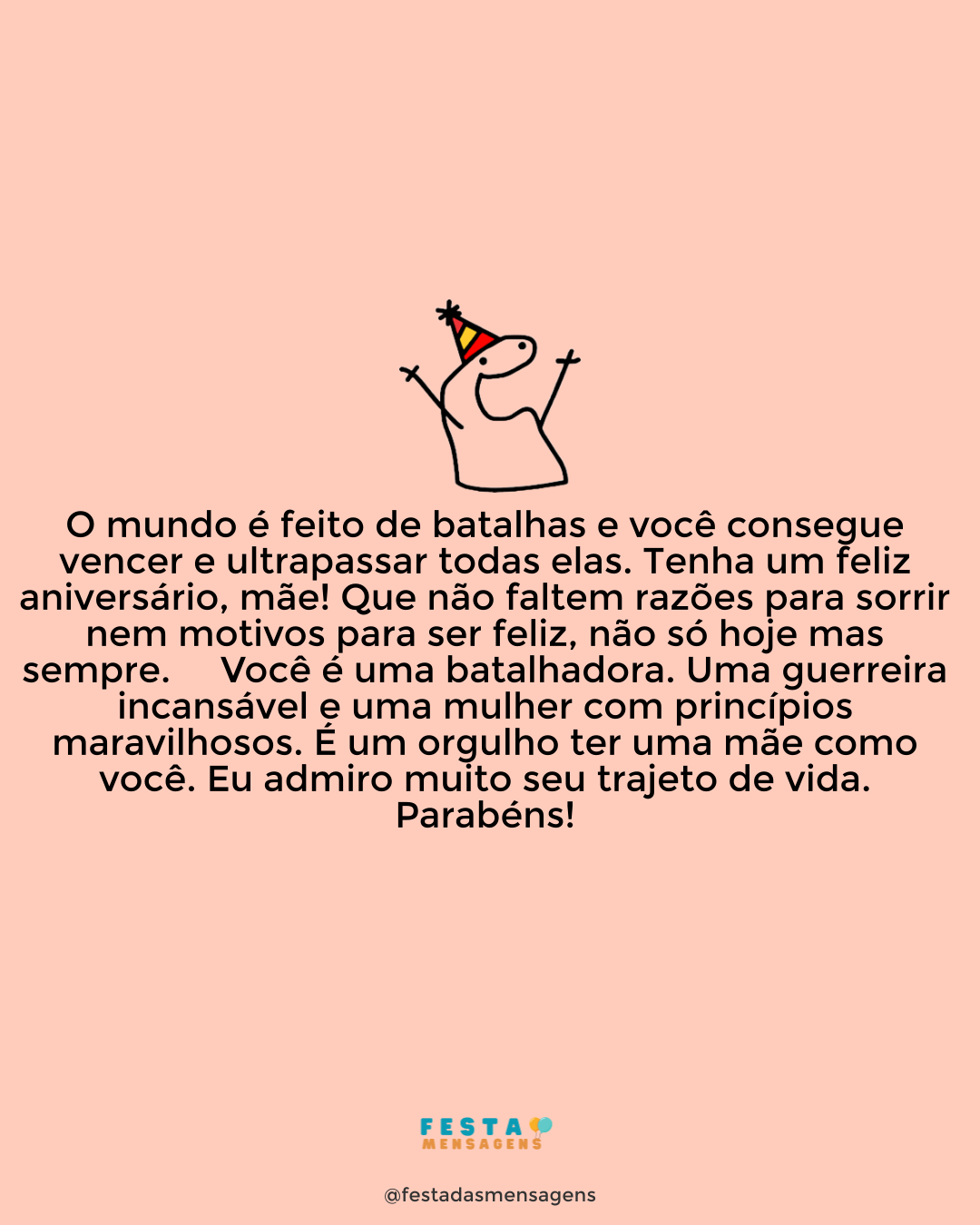 Parabéns! Tenha um feliz aniversário, mãe! Se você soubesse o quanto me inspira, o quanto me dá força e vontade de crescer, evoluir, lutar. Se você soubesse, mamãe, o quanto admiro sua forma de enxergar o mundo. Se você soubesse eu tenho certeza que o orgulho iria invadir seu coração. É um privilégio ter sua presença na minha vida. E só peço para que a vida nunca nos separe, porque temos um lindo e longo caminho a percorrer. Te adoro, mãe!