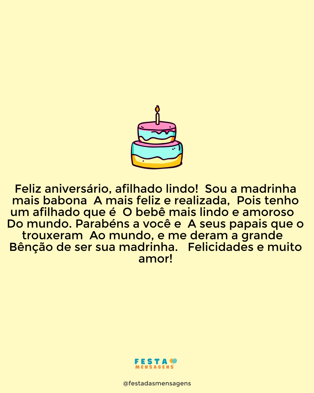 Querido padrinho, hoje é um dia abençoado, pois uma das melhores pessoas que já conheci na vida, e que é você, celebra seu aniversário. E se em mais um ano você teve a oportunidade de viver muitos sonhos, conquistas e todo um conjunto de novas experiências, eu tive o privilégio de contar com sua companhia, apoio e carinho. Você é muito importante para mim, padrinho, e não imagino minha vida sem você por perto. Eu o admiro muito e saber que sempre poderei contar com você me dá conforto e segurança. Desejo que seu dia seja iluminado por muitas alegrias e que estas persistam em seu coração o ano todo. Eu amo muito você, meu padrinho, e quero muito que seja feliz, hoje e sempre. Parabéns!