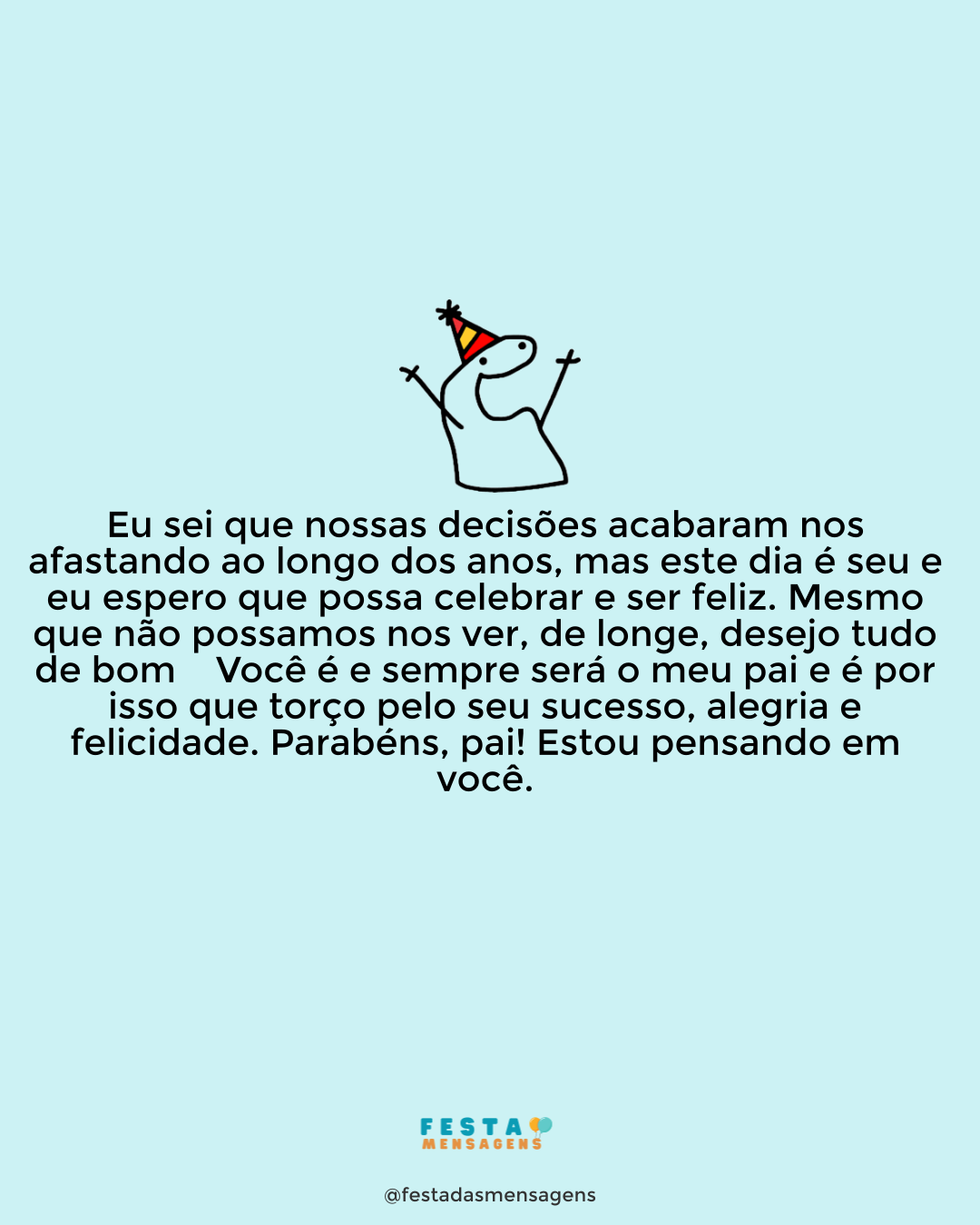Meu pai amado, este é o seu primeiro aniversário desde que você partiu. Hoje nós não vamos comemorar mais um ano da sua vida, mas vamos nos lembrar carinhosamente do dia especial que você chegou ao mundo para nos trazer tantos momentos felizes. Vamos relembrar os nossos dias e a nossa vida com você e tudo que você nos deixou de bom. Você já não está conosco fisicamente, mas a sua lembrança é muito viva e o nosso amor por você continua presente. Pai, a saudade hoje é ainda maior, e será inevitável não chorar. Pedimos a Deus que nos dê serenidade, paz e luz para confortar o nosso coração. Pai, sinta o nosso abraço. Nós te amamos!