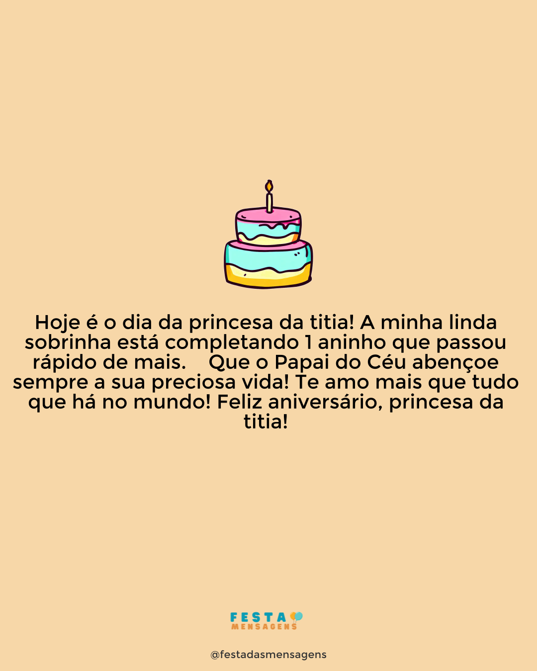 Neste grande dia em que se celebra o aniversário da sua chegada a este mundo, minha querida bisneta, quero que nunca se esqueça que é linda por dentro e por fora e que eu a amo com todo o meu coração. Não tem nem como explicar o amor que sinto por você. Basta olhar para o seu rosto inocente para me sentir rejuvenescer e esquecer todos os problemas da idade. Peço a Deus que a proteja em tudo o que venha a fazer na vida e que a abençoe com muita saúde e com muita felicidade! Que a sua vida seja plena e cheia de amor!