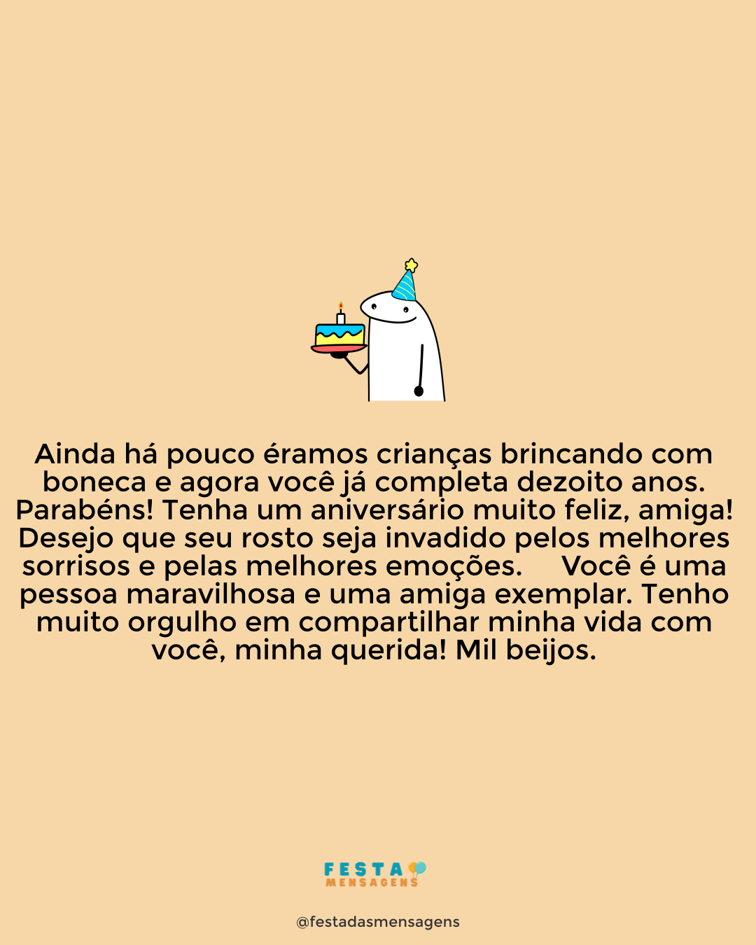 Você é uma pessoa tão querida que nem parece deste planeta. Gosto muito de você, amiga! E desejo que especialmente hoje você se sinta muito feliz e realizada. Tenha um feliz aniversário, querida! Celebre esta data junto das pessoas mais marcantes da sua vida e lembre-se que estarei sempre perto para tudo. Nunca mude seu jeito de enxergar a vida e as pessoas e mantenha-se assim: pura. Parabéns por mais um ano de vida, amiga! Beijo.