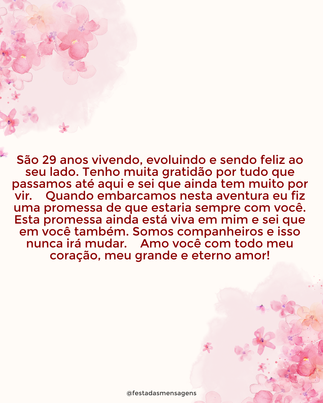 Parabéns, meu amor! É com muita felicidade que celebro seu aniversário mais uma vez. Só desejo que esse ritual se mantenha sempre. Sim, porque você é a pessoa que mais amo na vida, é minha alma gêmea, minha razão de viver. Na verdade, acho mesmo que não seria capaz de encarar a vida do jeito que encaro se você não estivesse do meu lado! E felizmente tenho certeza que você sente o mesmo comigo! Desejo que a alegria e a paz estejam sempre do seu lado, mas que se manifestem ainda mais no dia de hoje. Tenha um feliz aniversário, meu bem. Te amo!