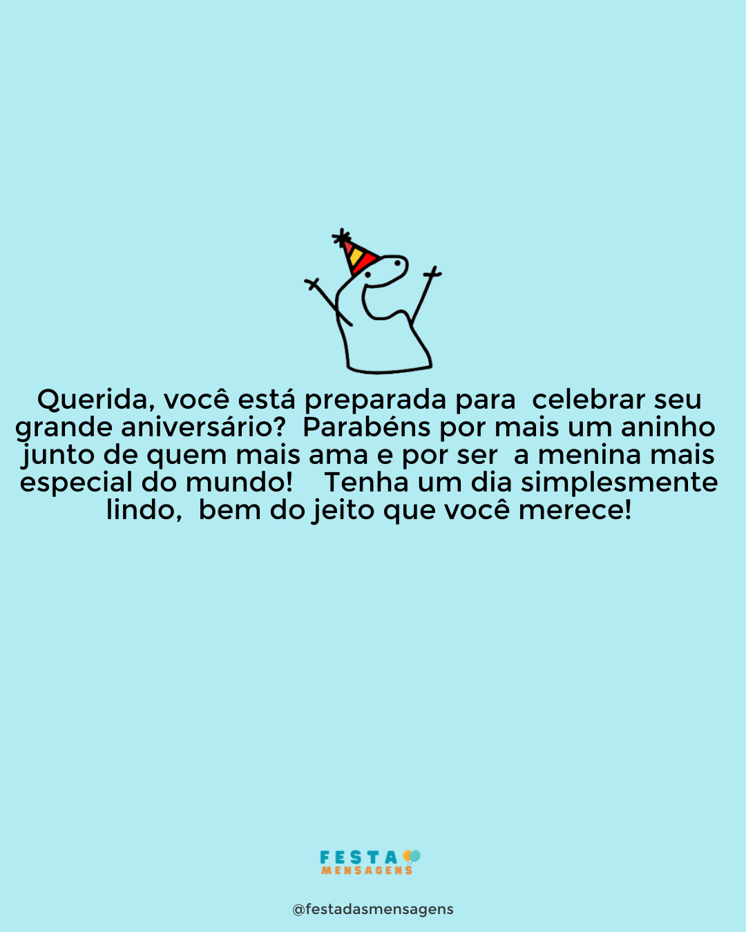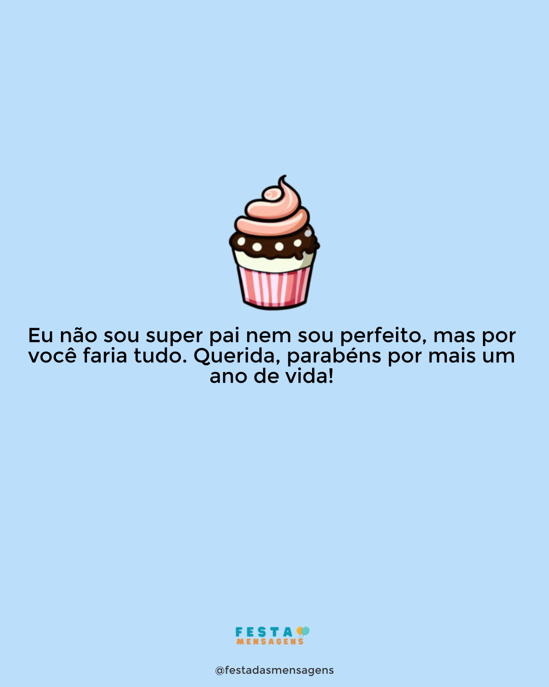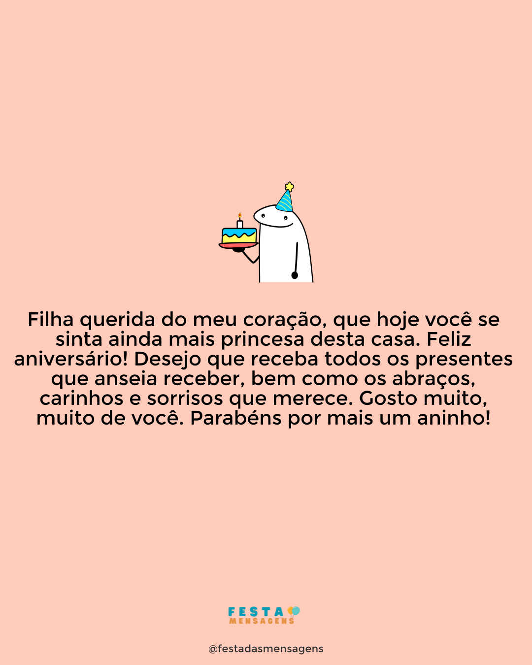 Ah, minha filhinha amada, nem acredito que já faz 12 anos que você chegou neste mundo e na minha vida. Filha, desejo que este novo ano seja repleto de alegrias, felicidade e novas descobertas, afinal, você está iniciando uma nova fase. Que sua adolescência seja cheia de aventuras e momentos inesquecíveis! Seja feliz, minha filha, e saiba que não importa o que aconteça, sempre estarei ao seu lado! Feliz aniversário!
