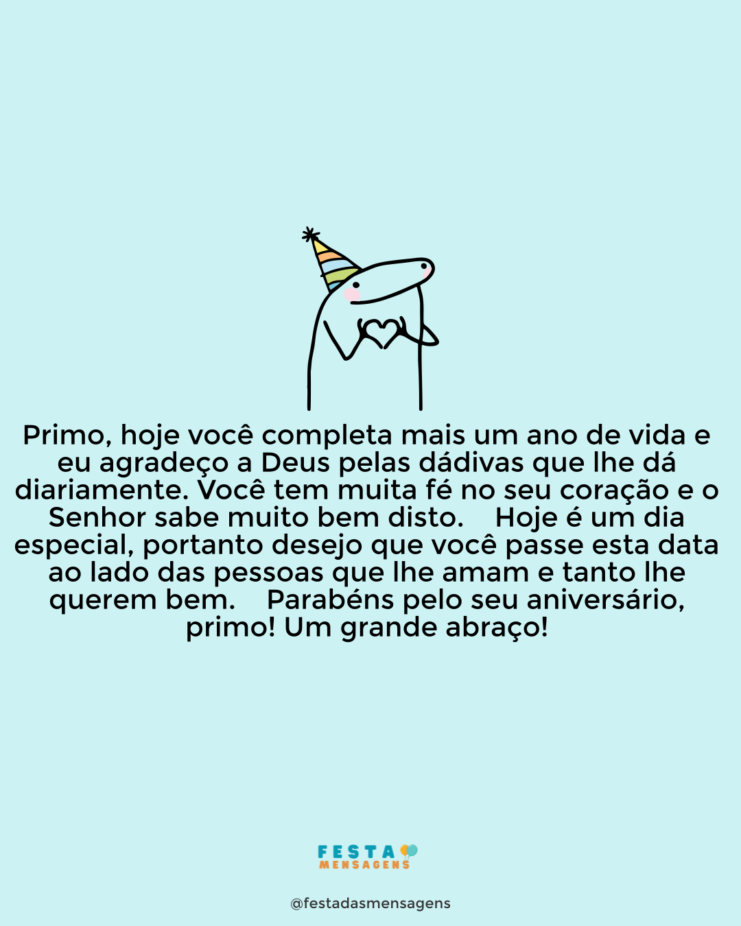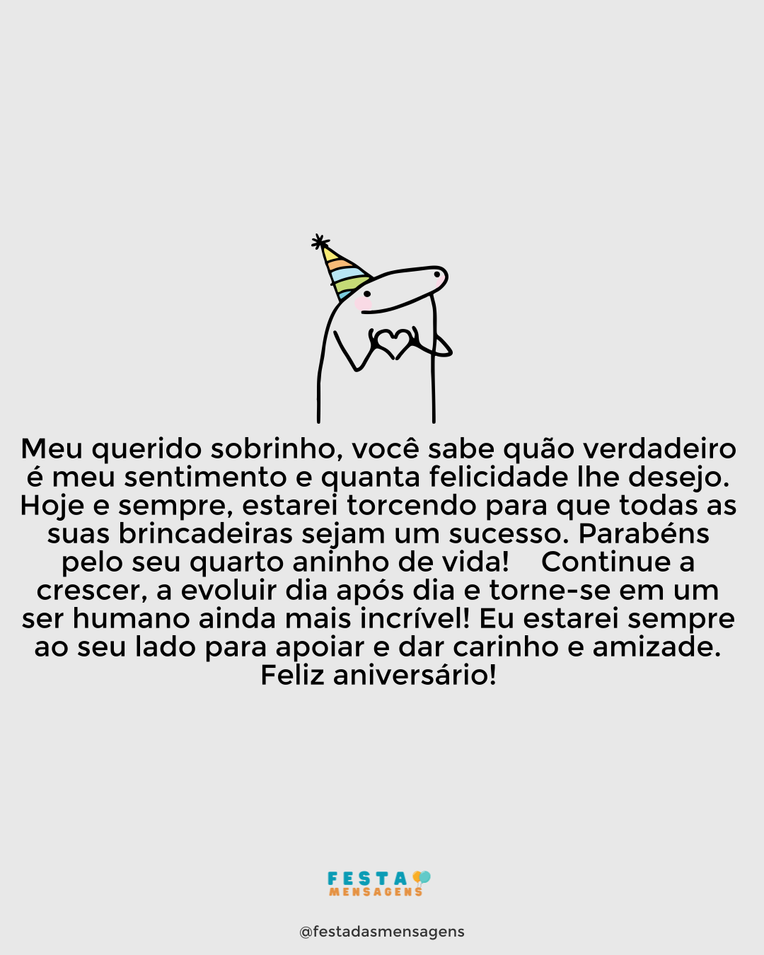 Louvado seja o Senhor por trazer tamanha alegria para meu coração ao agraciar meu neto com mais um ano de vida e por fazer dele um menino que segue o caminho do Senhor com tanta fé e convicção. Ao meu neto, desejo mais um ano de crescimento, evolução e aprendizado, tudo com Deus no coração e na mente para que nada lhe falte ou o desvie do seu caminho. Que seja um ano feliz e muito abençoado!
