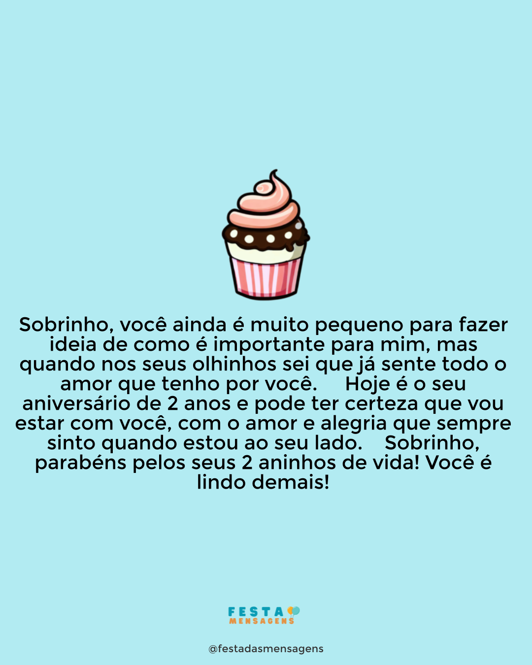 Meu amado filho, é inacreditável como os anos passaram rápido. Você faz agora 18 anos e, para mim, é como se eu estivesse todos esses anos ensinando você a andar. Mas a verdade é que você já aprendeu a voar, já saiu de debaixo das minhas asas, eu é que insisto em o trazer de volta para cá. Independente das minhas atitudes de mãe coruja, quero que você saiba que eu tenho muito orgulho de você, pois se está tornando em um homem forte e determinado, que sabe o que quer e sabe o que precisa fazer para o alcançar. Obrigada por ser esse filho tão maravilhoso que você é! Eu lhe desejo muita saúde, paz, sabedoria, amor e felicidades em sua vida. Parabéns, meu filho! Conte sempre com a sua mãe. Parabéns! Eu te amo!