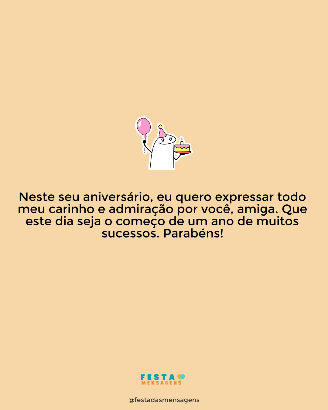 Feliz aniversário! Eu quero lhe dizer que você é a melhor amiga do mundo, a menina mais fofa e querida do planeta, o ser humano mais doce que existe. Tenho muito orgulho em ser seu amigo! Espero que você aproveite esta data para se realizar, para fazer tudo aquilo que vem adiando. A vida é sua e você merece vivê-la com toda intensidade. Que comece a festa da minha amiga! Parabéns!