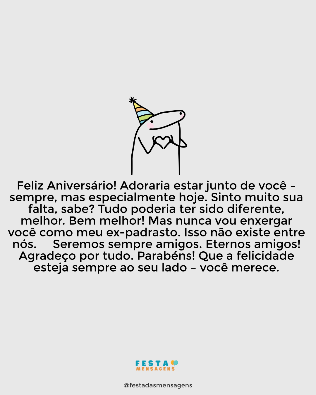Talvez você não se lembre, mas hoje é nosso aniversário de casamento. Como é que algum dia iríamos imaginar que não daria certo? Bem, o que importa é que a paixão deu lugar a uma incrível amizade. Por isso, como amiga, quero lhe dizer que aprendi muito com você, e que vivemos bons momentos juntos como casal. Hoje posso contar com você para tudo que eu precisar, tal como você pode contar comigo. Gosto muito de você e desejo que se realize profissionalmente e, quem sabe, encontre o verdadeiro amor da sua vida. Seja muito feliz. Parabéns à nossa amizade!
