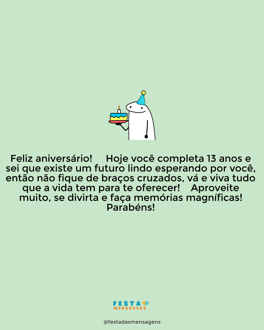 Parabéns! Hoje é dia de festa, alegria e muita animação, afinal, não é sempre que uma criança maravilhosa como você completa 12 anos de vida! Espero que seja um dia inesquecível e um ano de muita saúde e aprendizado! Feliz aniversário e um grande beijo!