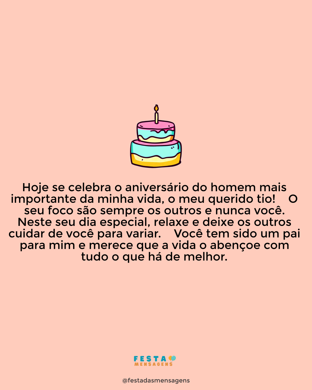 Hoje meu coração acordou mais feliz, pois é o seu aniversário e é com muito prazer e carinho que comemoro mais um novo ano com você. Parabéns pelo seu dia! Não desperdice nenhum segundo para começar a festa! O dia é seu e quero ver você celebrando ao lado das pessoas que ama e lhe querem bem. Esta data marca o começo de uma nova fase, mais 365 dias de luta, mas também de recompensas maravilhosas e é meu desejo que cada aventura nova que viver enriqueça a sua jornada.