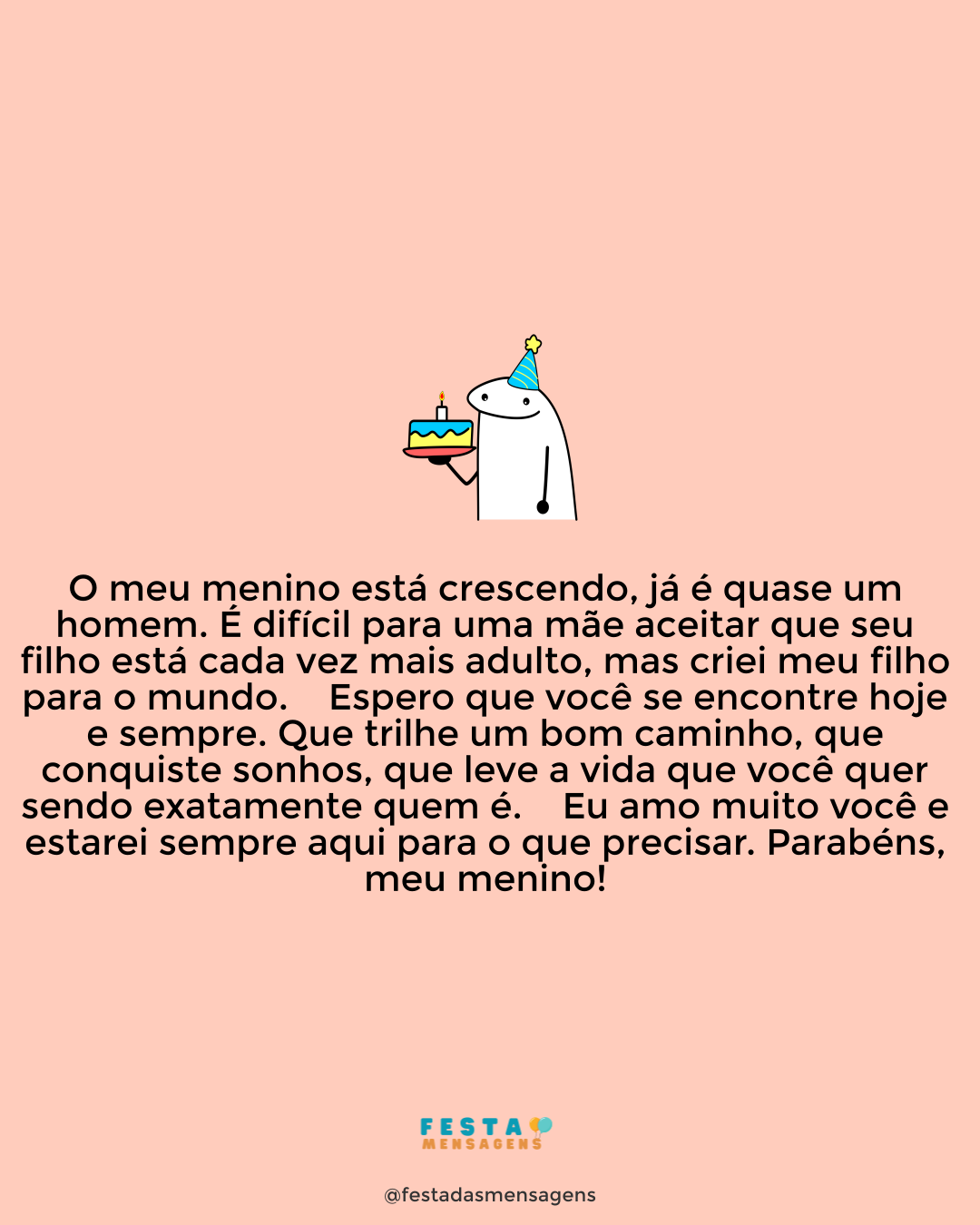 Para você que é o filho de coração que qualquer pessoa sonharia ter e que ilumina nossa vida com felicidade e generosidade, eu desejo um aniversário memorável! Parabéns, meu filho! Só espero que o amor continue guiando suas decisões. Feliz aniversário!