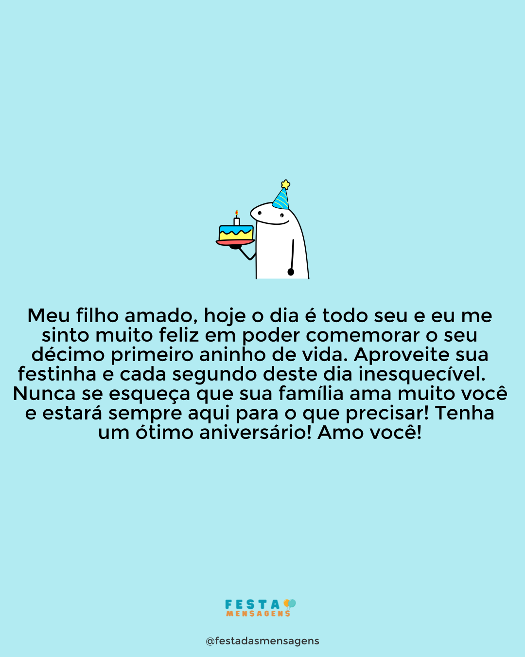 Feliz aniversário, filhão! Hoje você completa 11 primaveras e prepare-se porque temos um dia inteiro de festa para marcar esta data. Nunca se esqueça de que a vida é feita de momentos que, juntos, formam a nossa história. Então, se divirta muito e faça deste dia uma lembrança linda que irá carregar com você pela vida toda. Amo muito você e estou muito feliz em ver você completando mais um ano de vida! Parabéns, filho!