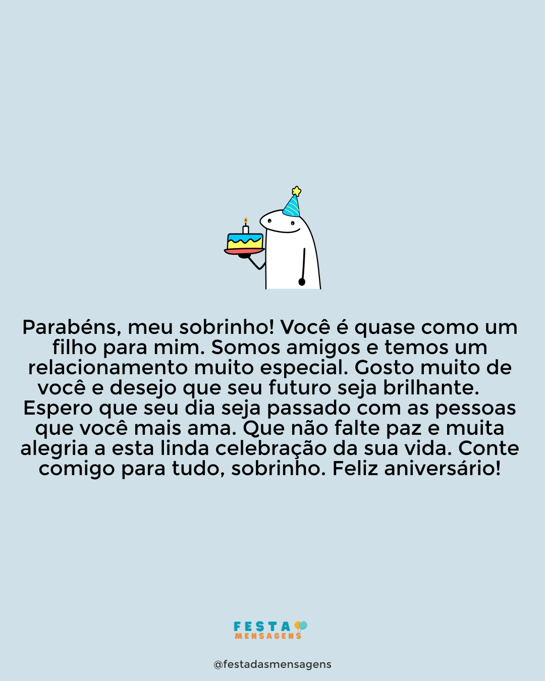 Parabéns, filhão! Agora já pode dizer que são vinte anos muitos bem vividos e repletos de acontecimentos incríveis, mas nada irá se comparar com o que ainda vem pela frente. Muita coisa ainda irá mudar na sua vida, mas estes primeiros vinte anos são a prova de que você é capaz de enfrentar tudo que a vida lhe trouxer. Você tem qualidades maravilhosas das quais tenho muito orgulho! Comemore muito o seu dia e aproveite a sua festa, afinal, não é sempre que se completa 20 anos de idade! Muitas felicidades, amor e saúde sempre!