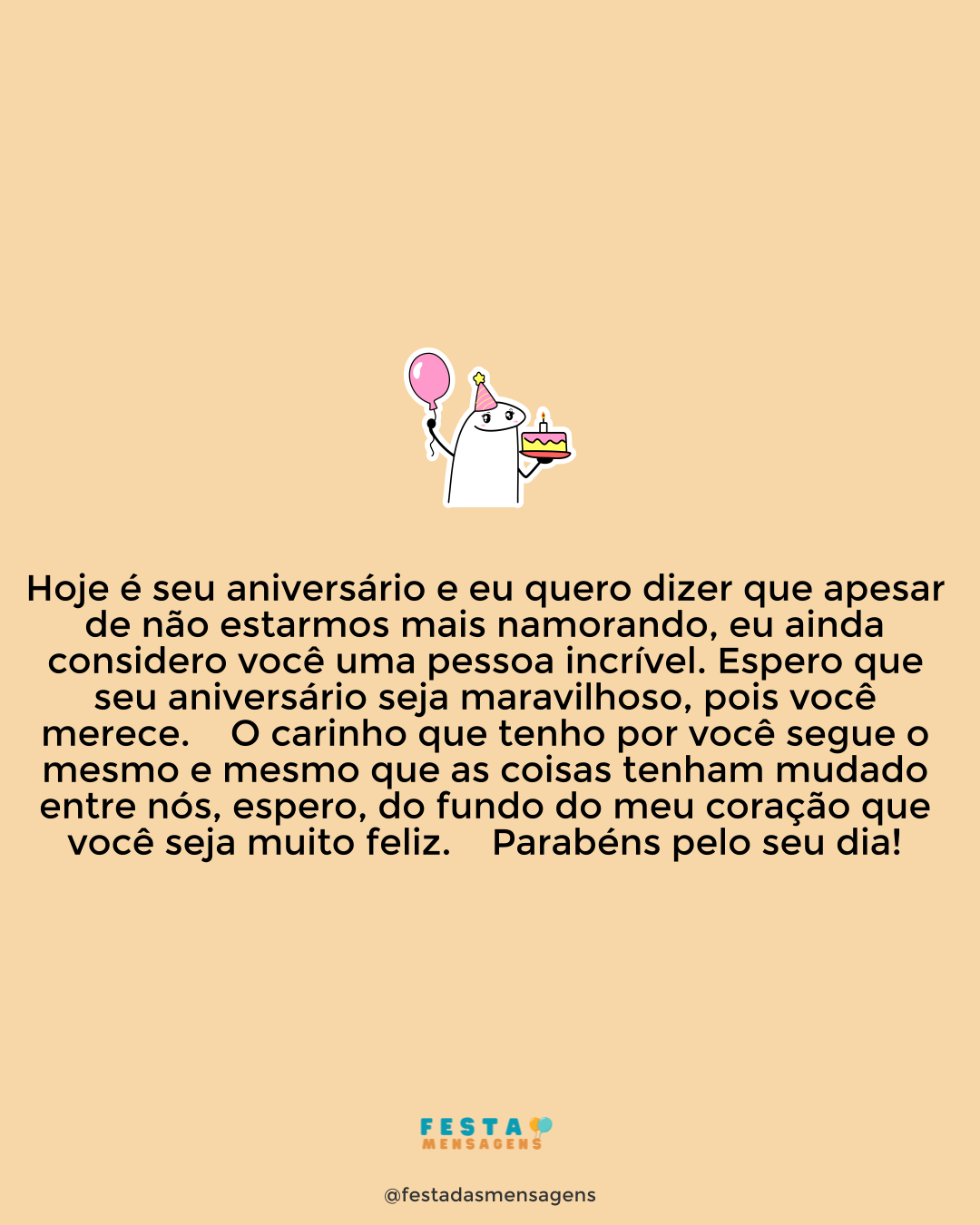 Ah, não poderia deixar de vir parabenizá-la, minha querida ex-sogra. Sei que nossos caminhos seguiram rumos diferentes, mas guardo um carinho enorme por você. Desejo que seu dia seja especial como deve ser, que possa estar perto das pessoas que ama e que receba muitos abraços e palavras de amor. Não tenho dúvidas que será um momento de muita celebração, afinal, você merece. Seja feliz hoje e durante todo este seu novo ano que começa agora. Sinto muitas saudades suas e nunca esquecerei de você e dos momentos que passamos em companhia. Tenha um feliz aniversário!