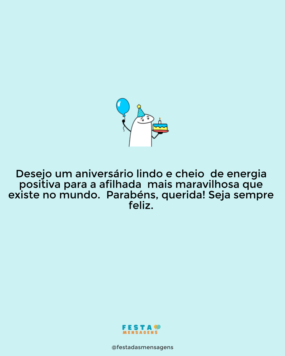 Hoje é o seu dia especial e, como seu afilhado, não podia deixar de parabenizar a pessoa maravilhosa e de gtande coração que Deus escolheu para meu padrinho. Este ano não poderei estar presente para lhe dar um forte abraço de parabéns, mas estarei aqui comemorando o seu aniversário da mesma forma. Adoro você, querido padrinho! Deus o abençoe e proteja sempre!