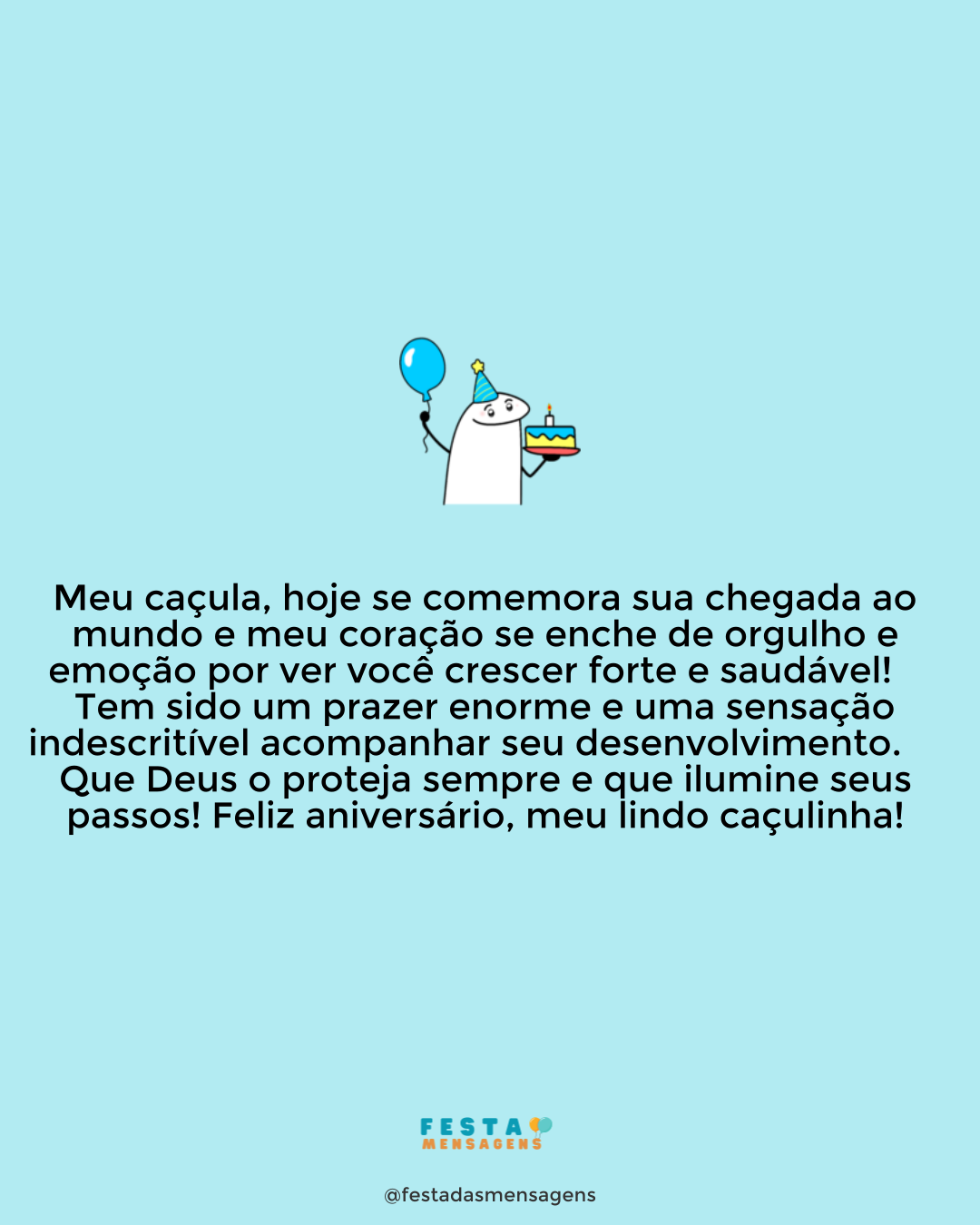 Querido filho, hoje você celebra mais um ano de vida e isso me deixa com um orgulho gigante no coração. Tenho uma grande admiração pela pessoa maravilhosa que você está se tornando. Feliz Aniversário! Que esse sorriso jamais desapareça do seu rosto e que nada de positivo falte ao seu coração. Gosto muito de você, querido! Parabéns!