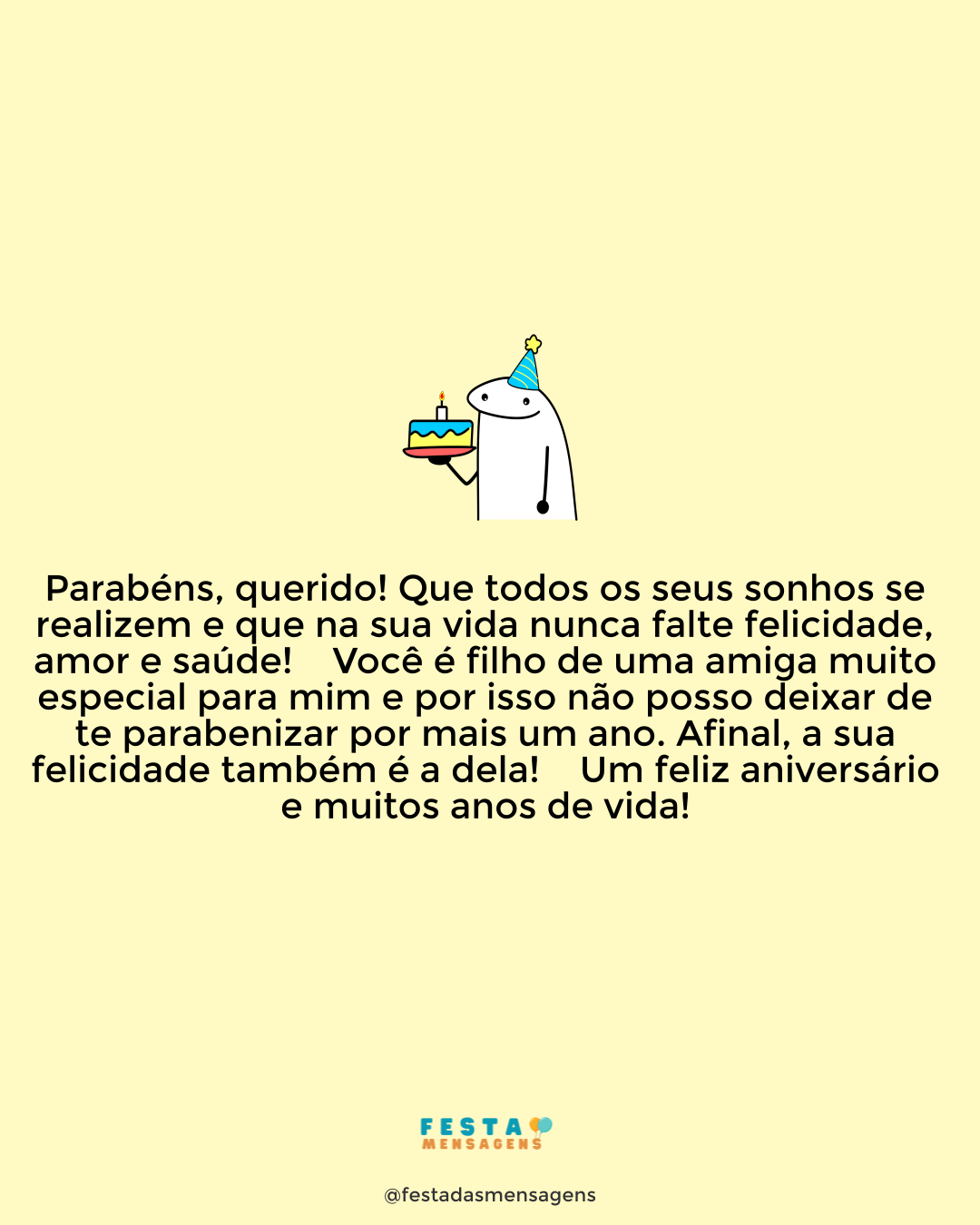 Meu querido sobrinho e afilhado, hoje que celebra mais um aniversário, saiba que é um enorme prazer ser sua tia e madrinha. Para sempre irei proteger e cuidar de você. Seu bem-estar e sua felicidade são muito importantes para mim desde o dia em que você nasceu. Não sei se me sinto mais sua tia ou sua madrinha, mas seja qual for o papel que desempenhe, será sempre o de alguém que ama muito você. Parabéns, meu menino lindo!