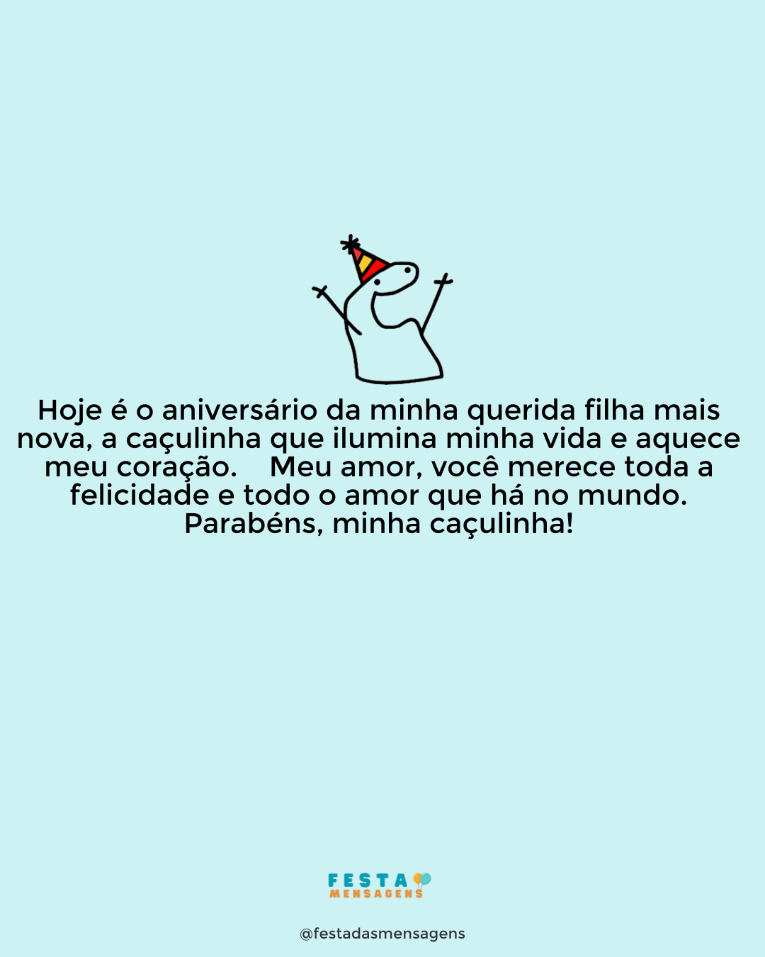 Querida filha da mamãe, hoje é seu dia, a data que marca mais um ano da sua linda vida. Saiba que a adoro profundamente e que a considero minha maior amiga. Feliz aniversário, meu bem! Sou a mãe mais feliz que existe neste mundo, porque você é a filha que sem-pre desejei ter na vida. Divirta-se muito hoje e todos os dias. Eu estarei sempre ao seu lado como mãe, amiga e mulher. Parabéns, filha!