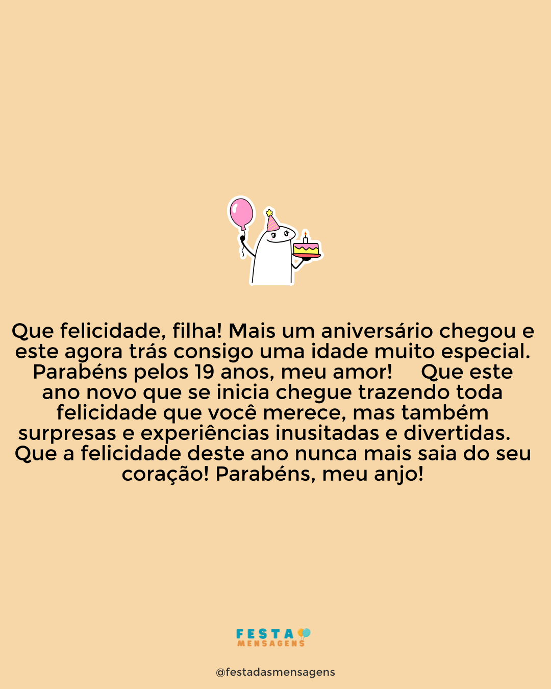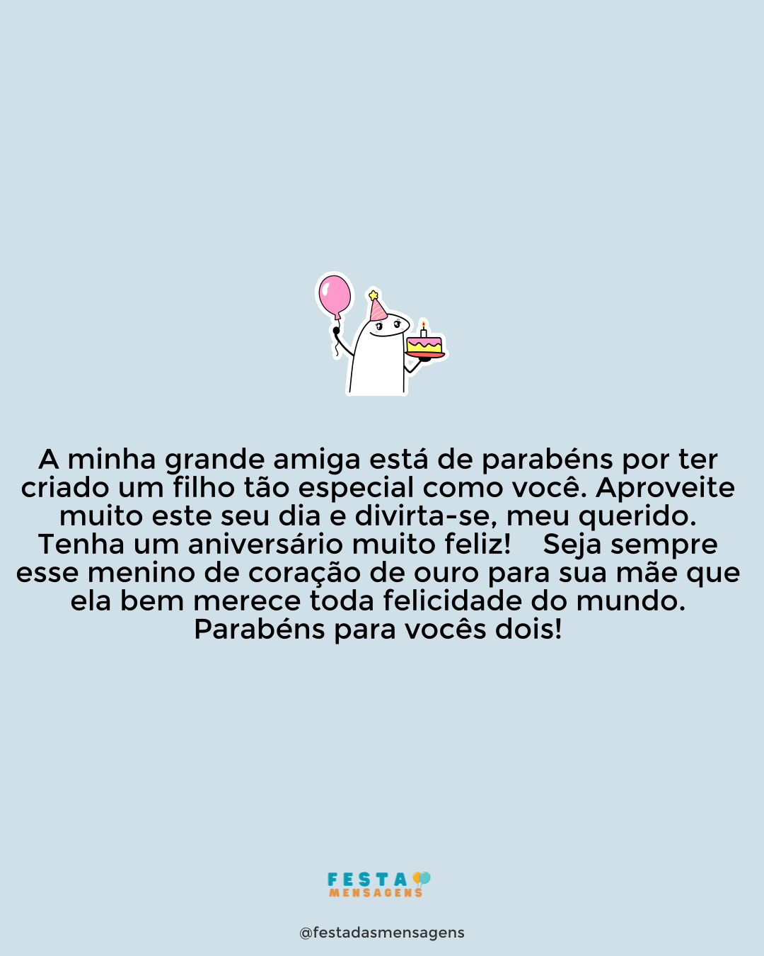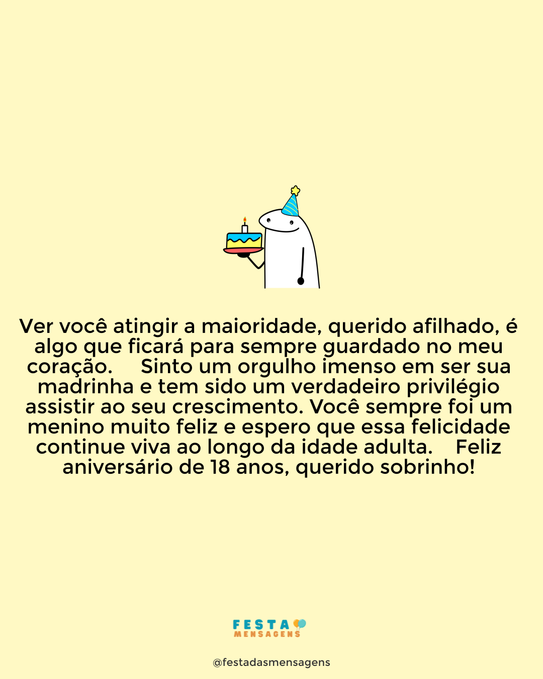 Meu amado filho, é inacreditável como os anos passaram rápido. Você faz agora 18 anos e, para mim, é como se eu estivesse todos esses anos ensinando você a andar. Mas a verdade é que você já aprendeu a voar, já saiu de debaixo das minhas asas, eu é que insisto em o trazer de volta para cá. Independente das minhas atitudes de mãe coruja, quero que você saiba que eu tenho muito orgulho de você, pois se está tornando em um homem forte e determinado, que sabe o que quer e sabe o que precisa fazer para o alcançar. Obrigada por ser esse filho tão maravilhoso que você é! Eu lhe desejo muita saúde, paz, sabedoria, amor e felicidades em sua vida. Parabéns, meu filho! Conte sempre com a sua mãe. Parabéns! Eu te amo!