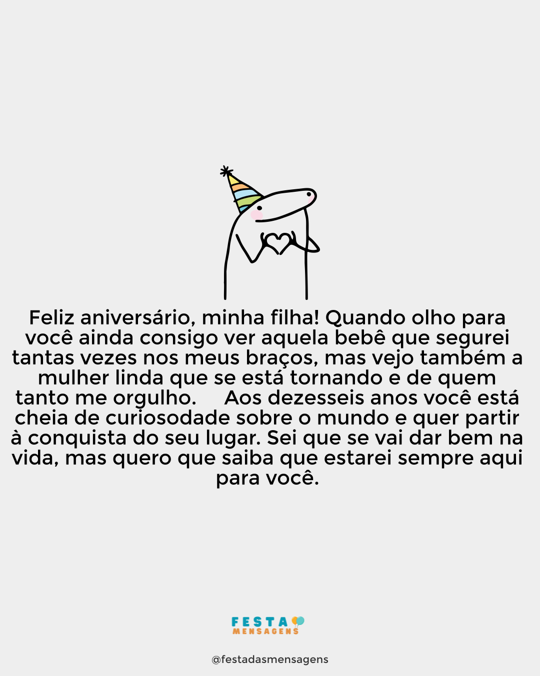 Minha filha querida e tão amada, tenha um aniversário incrível, feliz e cheio de alegria! São doze anos maravilhosos, repletos de momentos lindos e sem igual. Parabéns, princesa! Não sei se alguma vez lhe confessei, mas você é a filha que sempre sonhei ter em toda minha vida. Quero também que você saiba que estarei sempre ao seu lado, aconteça o que acontecer. Hoje, eu quero muito que seu coração celebre todos os segundinhos do dia e junto das pessoas que mais ama neste mundo. Prepare-se para uma grande festa, filha! Ah, e muitos presentes, é claro!