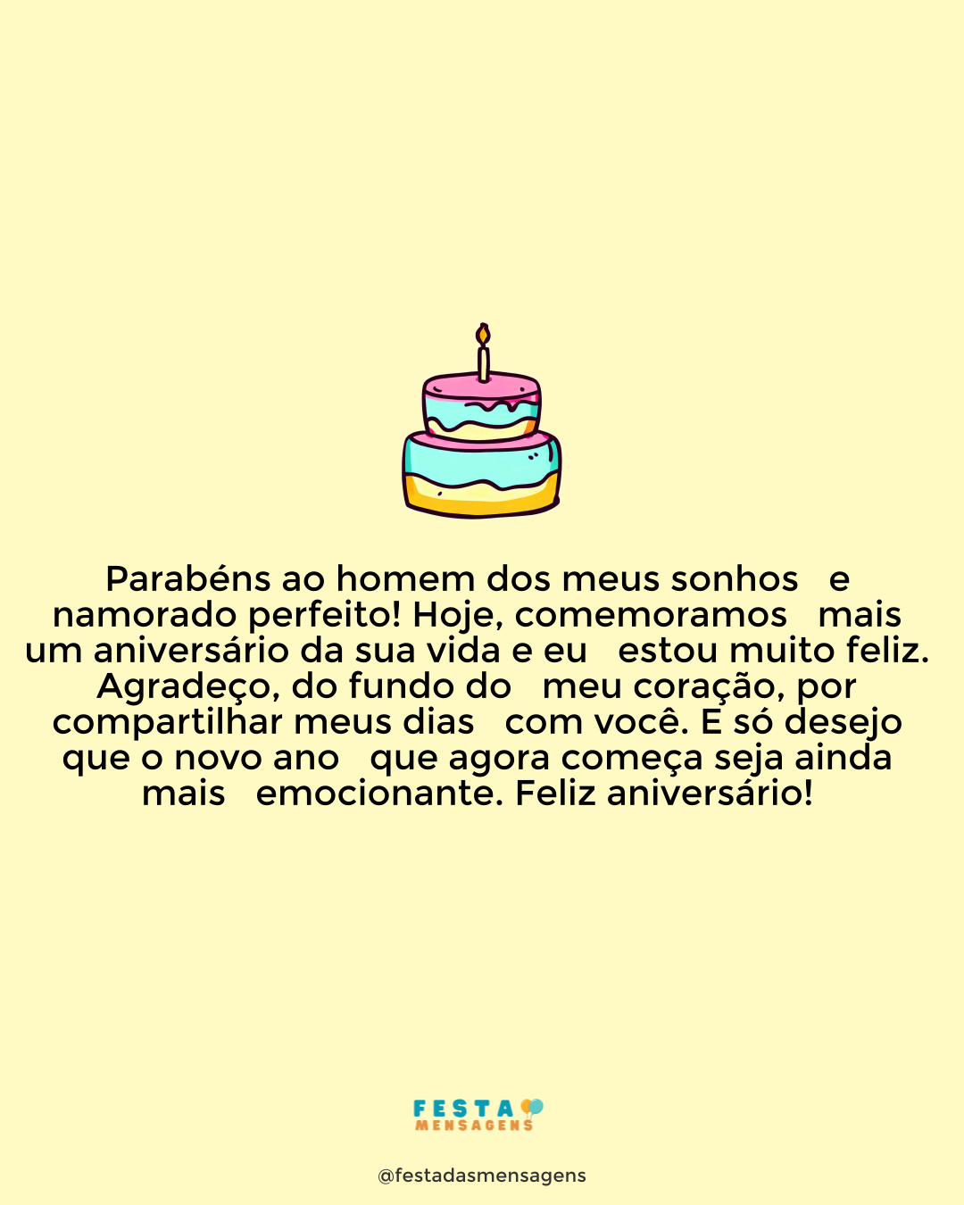 Em breve nossas vidas vão se tornar uma só, mas enquanto isso não acontece vamos celebrar outro momento que também tem tudo para ficar marcado na nossa história. Parabéns por mais um ano de vida, meu amor! Este é o seu último aniversário antes do nosso casamento e, mesmo sabendo que você não vê a hora de unirmos nossos corações definitivamente, sei que também não vai deixar passar este dia sem comemorar muito! Parabéns, meu amor! Muita saúde, sucesso e alegria hoje e sempre. Amo você!