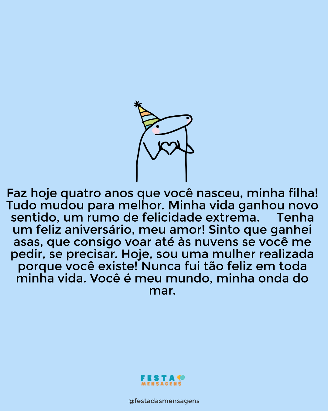 Hoje é um dia abençoado, pois há 6 anos, recebi o melhor presente de Deus: minha neta nasceu. Desejo que seu dia seja repleto de amor, alegria e felicidade, minha netinha. Que seu novo ano de vida traga muitas novidades e muito aprendizado. Você está crescendo muito rápido e eu não consigo deixar de me emocionar a cada ano. Que seja um dia especial, como deve ser. Feliz aniversário!