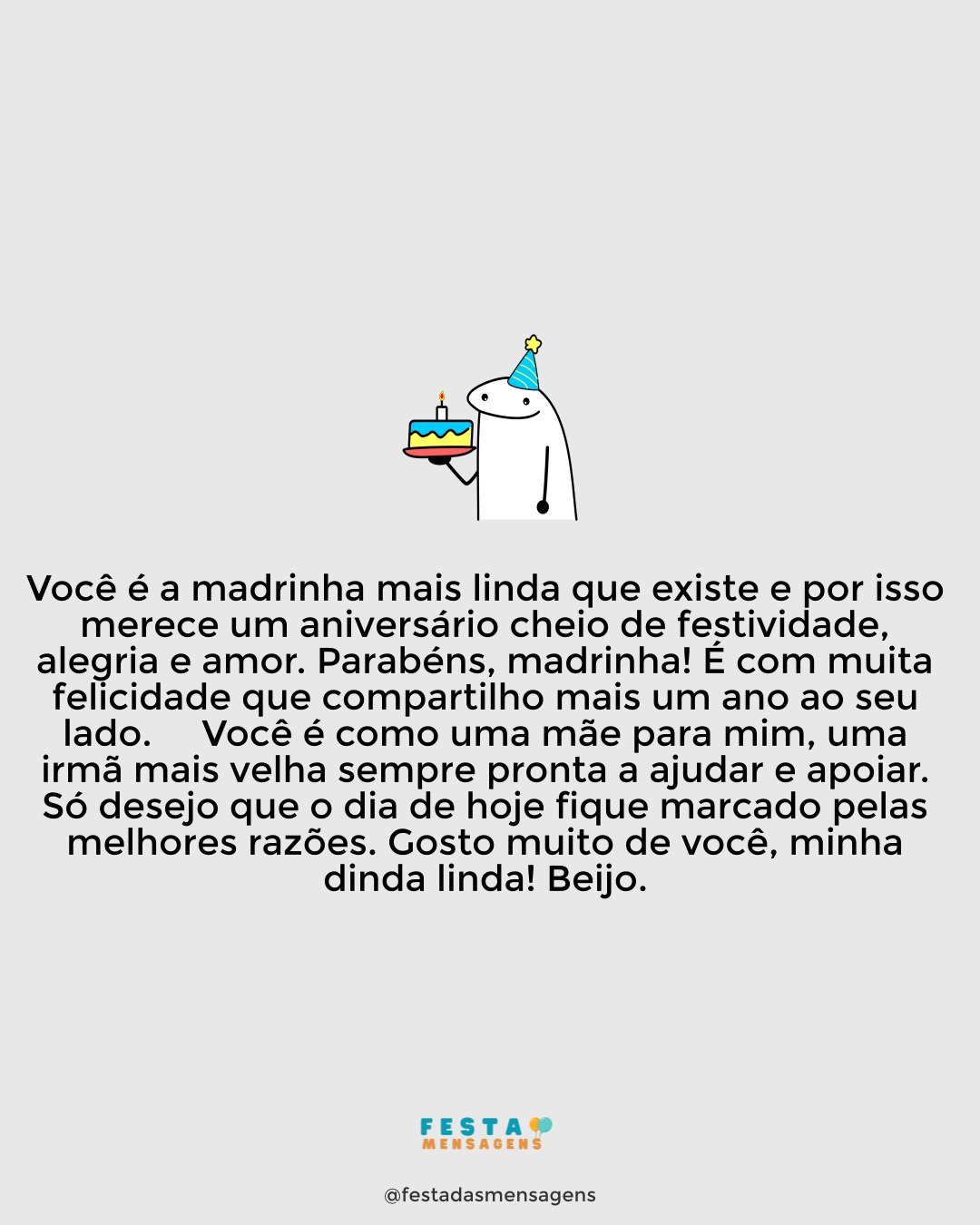 Mãe querida, minha mãe amada, hoje é um dia muito especial na sua vida, mas também muito especial para todos nós da família. Você é a nossa raíz, o nosso tronco, a nossa força. Você, com toda a sua generosidade, sabedoria e amor incondicional nos permitiu florescer e confiou em cada um de nós, e nos frutos que decidimos plantar. Mãe, se hoje eu sinto-me satisfeito com a pessoa que me tornei, tenha a certeza que isso é graças a você. Você me ensinou a ser confiante e a lutar por aquilo que eu queria e acreditava. Você me guiou e me orientou para que usasse as características da minha personalidade da melhor maneira possível. Mãe, você para mim foi e é perfeita! Eu lhe desejo toda a felicidade em sua vida que ela seja ainda mais rica de amor, saúde, paz, realizações e grandes emoções. Parabéns mãe!