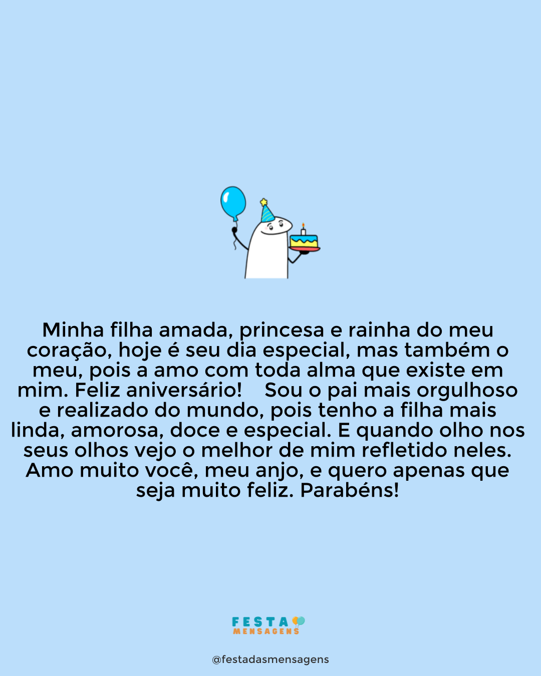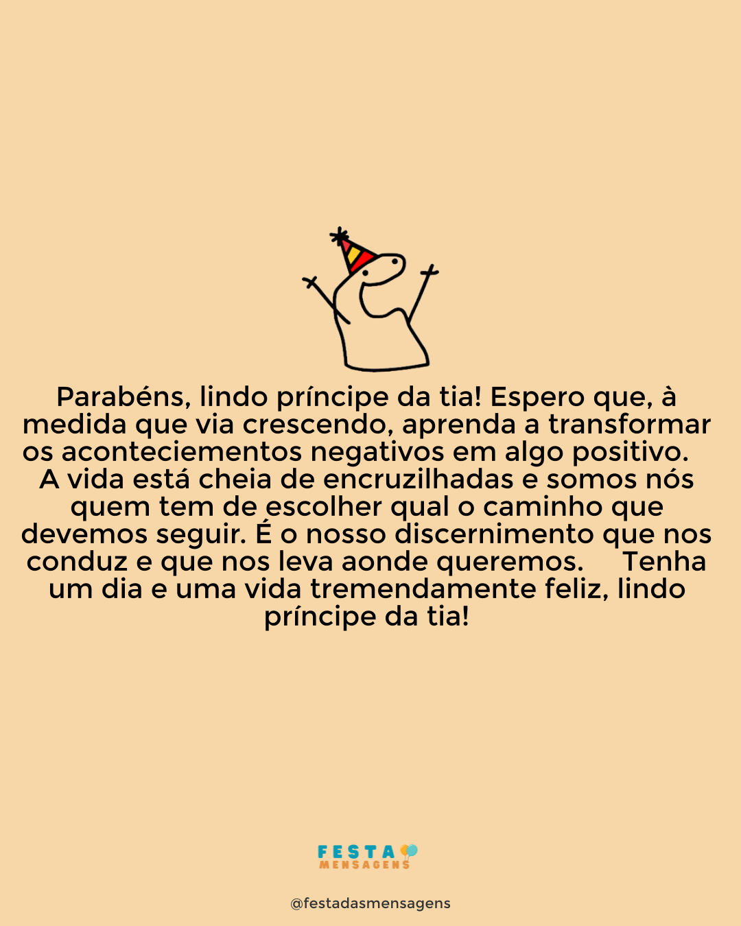 Existem pessoas que desempenham tão bem seu papel que acabam se misturando com outro ainda mais especial. É o seu caso, tio. Para mim, você é e sempre será um segundo pai para mim. Parabéns por mais um ano de vida! Gosto muito de você. Sempre nos demos muito bem. Às vezes parecemos irmãos, outras você parece e se comporta como um pai para mim. Esse conforto, essa alegria simplesmente não tem nome; é algo maravilhoso que só quero aproveitar e aproveitar. Acho que é por isso que torço tanto pelo seu sucesso. E hoje não poderia ser diferente. Aproveite muito seu aniversário, tio, e lembre-se que o adoro acima de qualquer outra coisa. Curta seu dia e orgulhe-se da pessoa deslumbrante e do coração de ouro que carrega no peito. Parabéns!