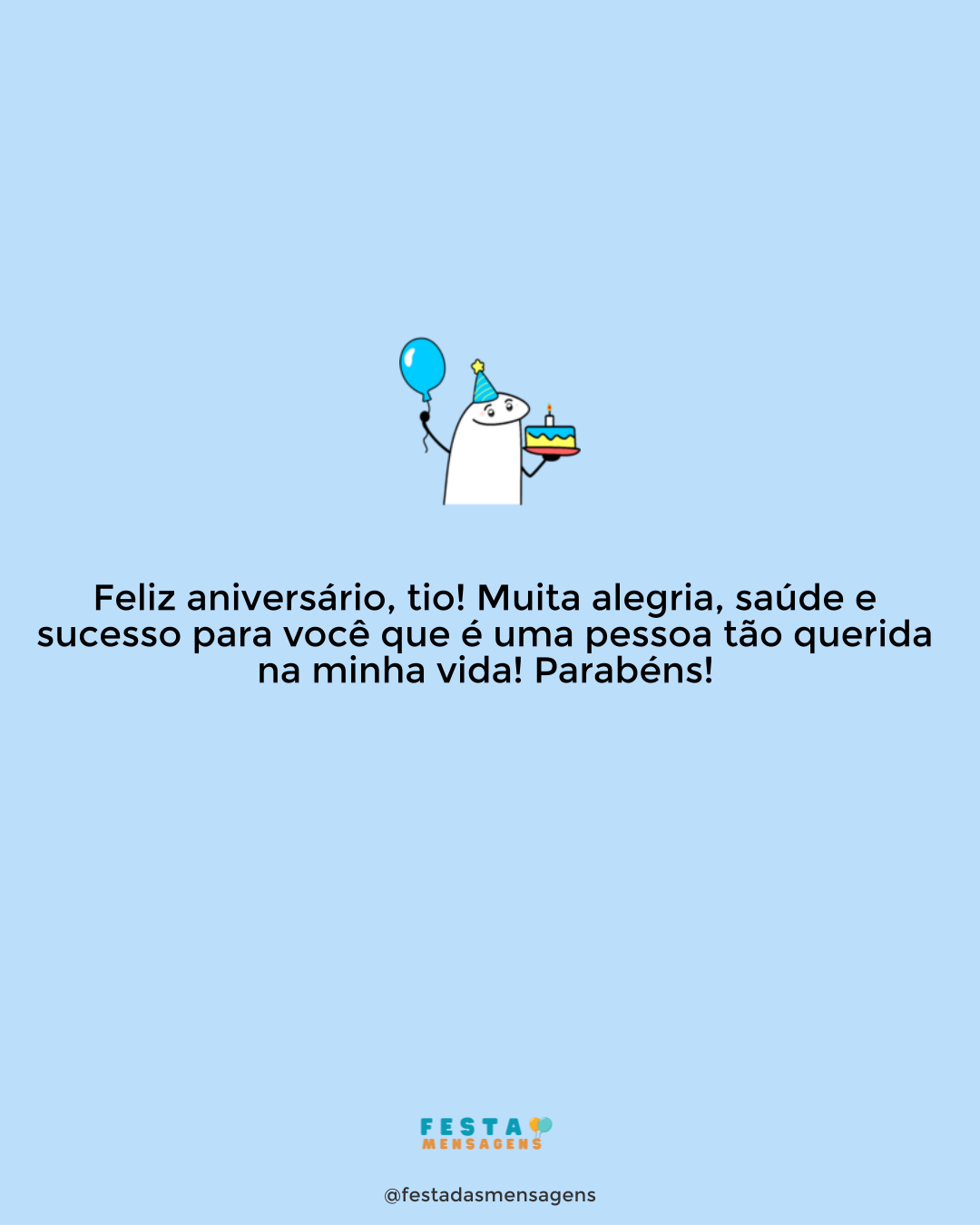 Que o seu dia traga paz, amor e alegria. Completar mais um ano de vida é sempre uma dádiva, é uma oportunidade de buscar sonhos e felicidade, por isso, aproveite. Que seja um dia repleto de amor, de carinho, de abraços calorosos e sorrisos sinceros. Deixo aqui a minha singela homenagem pelo seu aniversário e pela pessoa incrível que você é.
