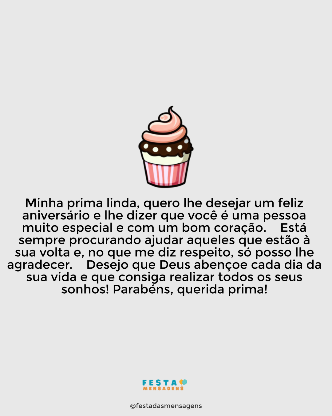É estranho para mim celebrar este seu dia. Estamos falando de trinta e quatro anos de vida, minha filha. Isso significa que eu estou envelhecendo e isso me preocupa. Brincadeira! Eu quero é que você seja sempre feliz. A mim não interessa a sua idade, mas sim a alegria que mora no seu coração, a paz e beleza que reside no seu pensamento. Tenho muito orgulho, princesa, por ter uma filha tão generosa e especial como você. Divirta-se muito, aproveite em grande estilo esta data que marca mais doze meses de aventuras inesquecíveis. Você é e sempre será a razão da minha existência, o motivo maior da minha felicidade. Parabéns, querida, por estar crescendo de bem com a vida, por ser uma mulher completa, realizada e imensamente feliz. Parabéns também por lutar pelos seus sonhos e por tudo aquilo em que acredita. Você é a minha inspiração. Feliz aniversário!