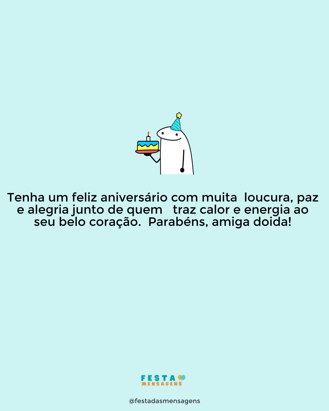 Eu tenho uma amiga doida. Outra que não bate muito bem. Tem aquela a quem falta um parafuso. Tem aquela que vive reclamando. Tem aquela que não para de sorrir. Tem aquela que já é mãe. Tem aquela que adora uma bagunça. Tem também a sonhadora. Tem também a pé no chão. Tem uma que adora um barraco. Tem outra que quer virar uma avestruz. Tem a tímida e a devassa. Mas todas fazem parte do meu mundo. Mexeu com elas, mexeu comigo! E de todas essas amigas, você é a mais especial, a minha melhor amiga! É por isso que hoje é um dia de grande alegria para mim. Vou estar sempre ao seu lado. Feliz Aniversário!