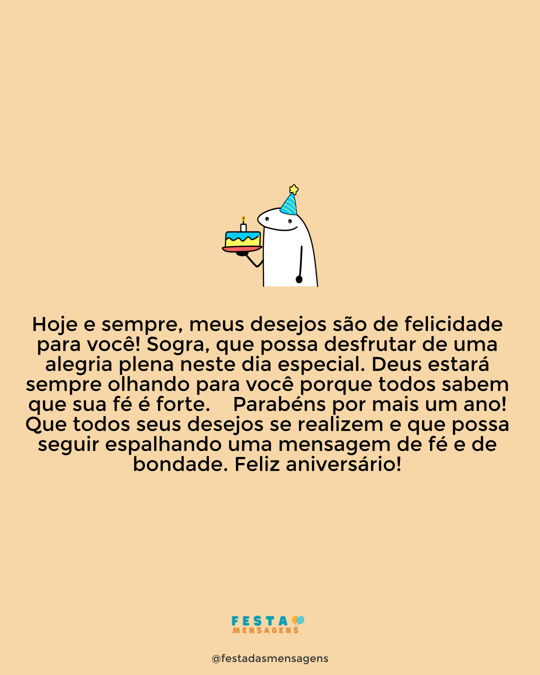 Tenha um dia de aniversário feliz e na companhia de Deus, querido netinho! Todos fomos criados à Sua imagem, por isso, somos especiais, cada um à sua maneira. Para mim, você é o mais especial de todos e agradeço todos os dias a Nosso Senhor por ter colocado você, um neto tão maravilhoso, na minha vida. A cada ano que passa, espero que continue firme e seguro nos seus passos e que vá ultrapassando os obstáculos que lhe são postos no caminho. Deus nos põe à prova todos os dias, por isso, devemos sempre continuar no caminho do amor e do bem.