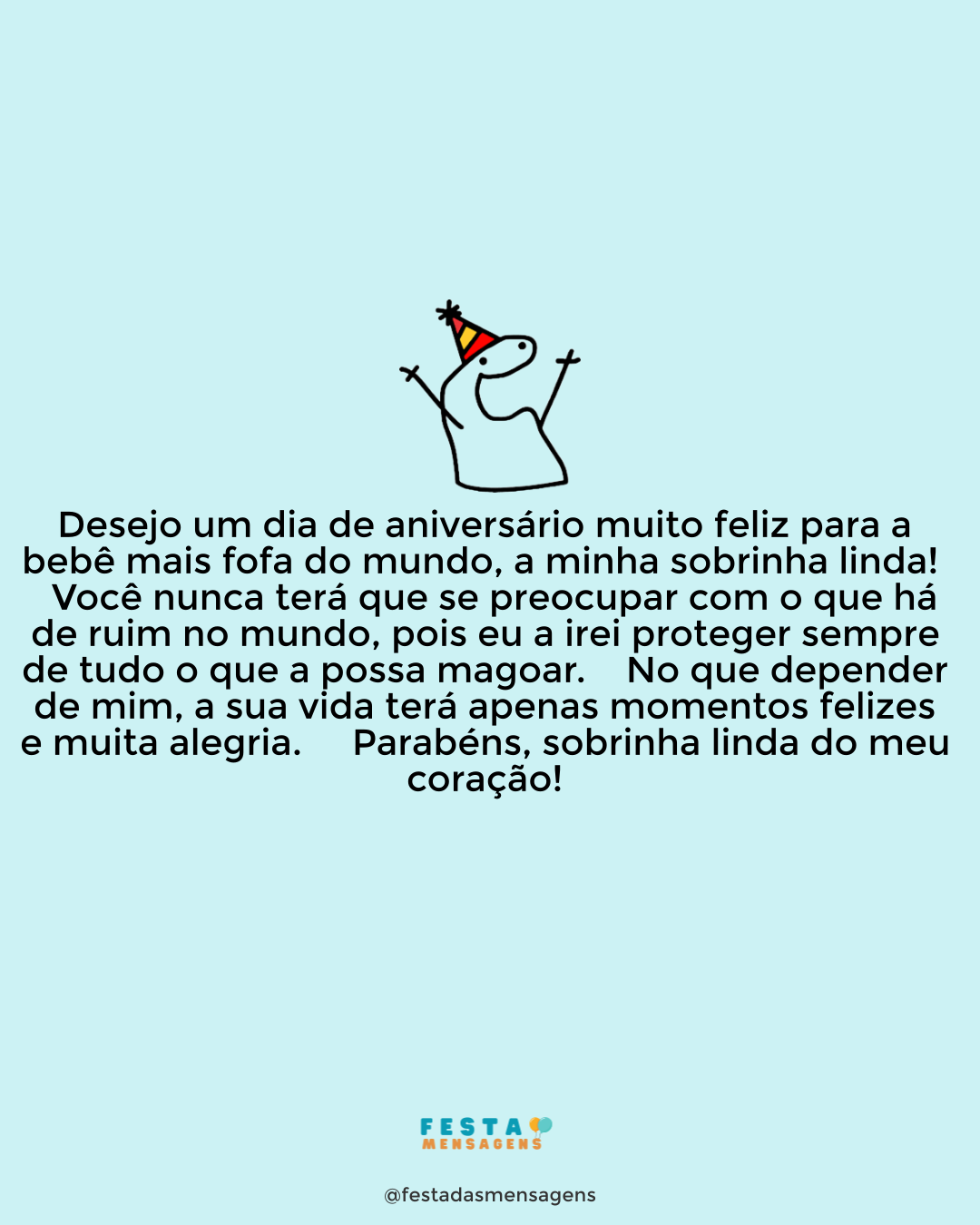 Hoje é dia do seu aniversário, querida. Parabéns por um ano de provações e vitórias infinitas! Que o Senhor continue abençoando seus dias e guiando pelo caminho do bem. Divirta-se muito, e lembre-se que sempre estarei ao seu lado para qualquer coisa. Feliz aniversário, sobrinha!