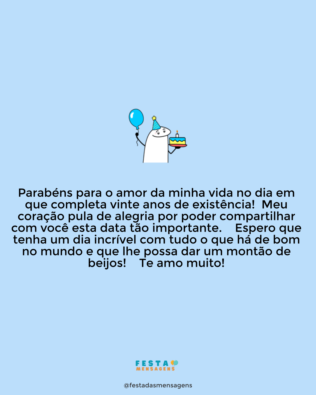 Parabéns, menino! Como é possível você ter crescido tão rápido? É incrível como o conheci tão pequeno e hoje está quase do meu tamanho. Saiba que sua mãe é uma grande amiga que respeito e tenho muita admiração. Divirta-se muito. A vida existe para ser saboreada, aproveitada em grande estilo. Nunca deixe de correr atrás dos seus sonhos, de tornar real aquele desejo que parece tão distante. Conte comigo para tudo; a minha amizade será sempre sua também. Que hoje tudo seja maravilhoso. Curta muitos seus presentes e, acima de tudo, sinta-se em paz. Feliz aniversário.