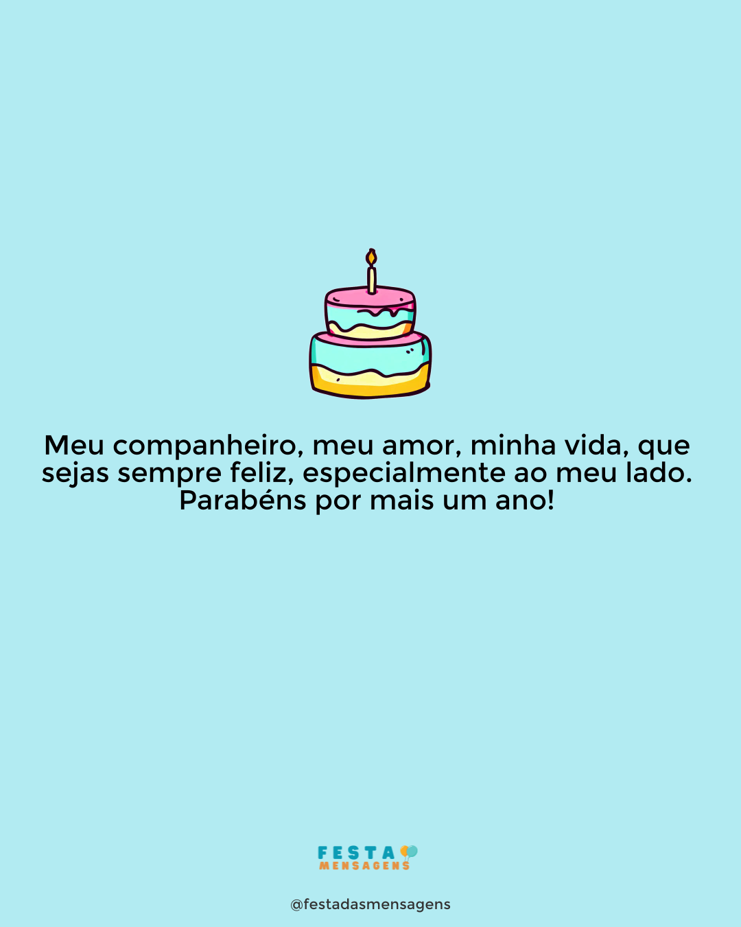 Parabéns, meu amor! Hoje você completa mais um ano de vida. Tem sido uma existência maravilhosa neste mundo cheio de cores. Sinto uma felicidade gigante por compartilhar este data tão especial com você. É um privilégio marcar presença ao seu lado hoje e todos os dias. Só espero e desejo que seu coração esteja batendo de alegria, porque o meu está radiante. Aproveite todos os instantes de hoje com seu lindo sorriso no rosto. Tenho um presente especial para você. É algo especial; a melhor coisa que tenho para lhe oferecer. Meu noivo, meu amor, meu presente para você é a promessa da minha fidelidade para sempre. Te amo!