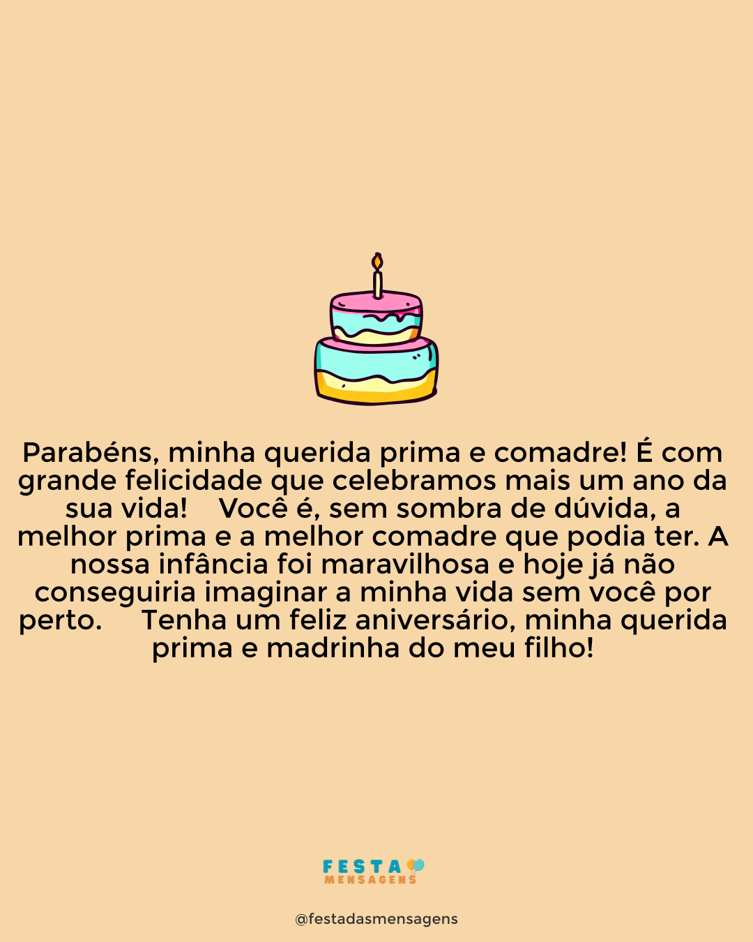 Hoje o dia amanheceu com mais alegria por causa do seu aniversário, minha prima e comadre querida, e não quero ver nada ficando entre você e a comemoração desta data! Você é uma pessoa que mora no coração de todo mundo que faz parte da sua vida e tenho certeza que não há uma pessoa que não esteja torcendo pela sua felicidade e sucesso. Espero que você tenha um dia maravilhoso e repleto de felicidade. Parabéns, minha amiga, prima e comadre. Adoro você!