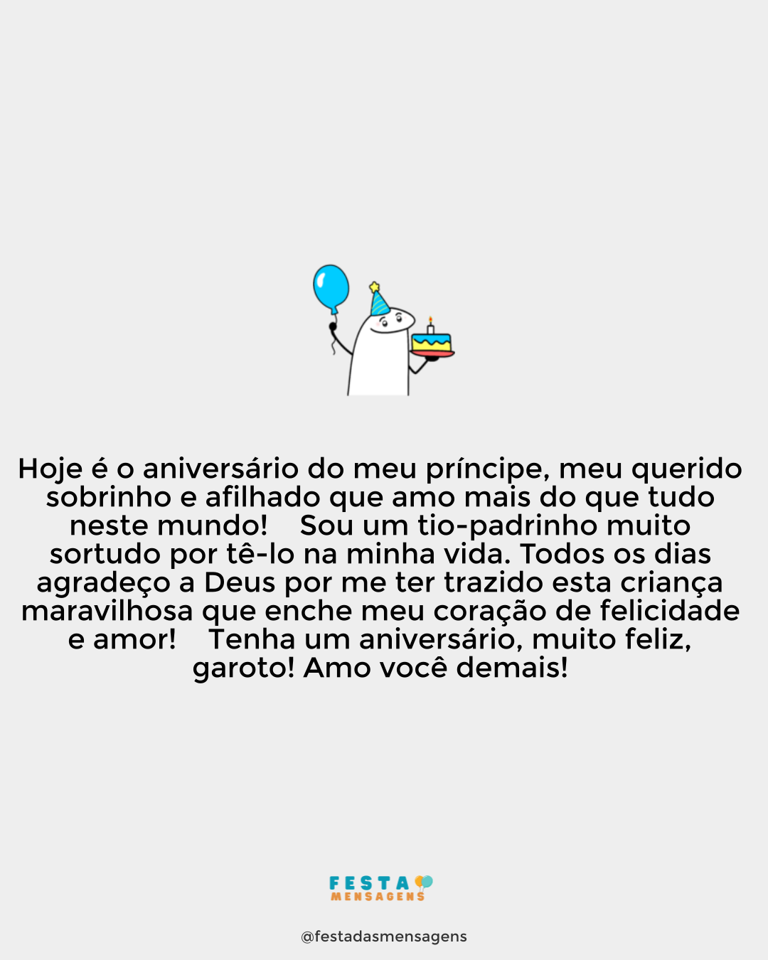 Ah, não posso acreditar que este momento finalmente chegou. Hoje é o seu dia de princesa, querida afilhada. Você está completando 15 anos e eu só posso desejar que seja uma noite inesquecível. Tenho certeza que tudo será perfeito na sua noite mágica e que seu aniversário trará apenas felicidades para você e sua família. É muito emocionante estar aqui neste dia tão importante. Parabéns, minha afilhada amada! Estarei ao seu lado sempre!