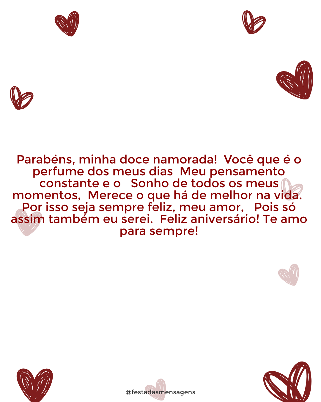 Cunhada e irmã, amiga eterna, você está de parabéns por mais um ano de muitas alegrias e aventuras. Que a vida continue sorrindo na sua direção e tudo de maravilhoso lhe aconteça, hoje e sempre. Feliz aniversário! É incrível como nossa ligação começou. Uma grande amizade a partir de um simples acaso. Só espero que nunca percamos o que nos une: o sentimento verdadeiro. Feliz aniversário!