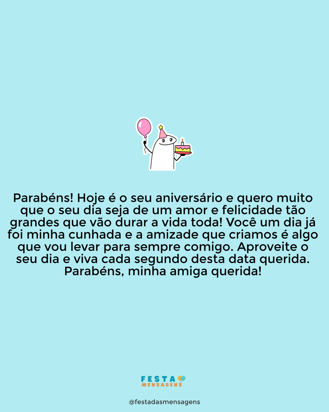 Não tenho palavras para descrever quão maravilhosa você tem sido. Você é minha melhor amiga a quem desejo um fantástico e espetacular dia de aniversário. Deus me concedeu um verdadeiro milagre quando a colocou na minha vida e não há dia em que não Lhe agradeça por isso. Espero que tudo o que deseja se torne realidade e que todos os seus sonhos se realizem. Você desperta em mim um carinho e uma ternura sem fim. É muito bom ter você na minha vida. Te adoro, querida amiga! Tenha o melhor aniversário do mundo!