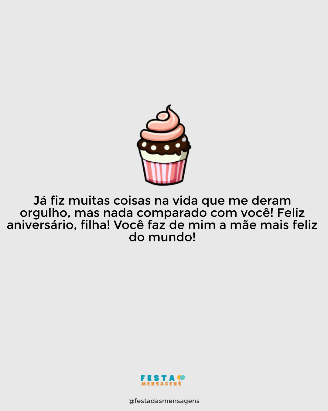 As mães são os anjos que Deus escolhe para cuidarem de cada um de nós. Feliz Aniversário, Mamãe! O que seria de mim sem você na minha vida? Não consigo e nem quero imaginar. Te amo, mãe! Parabéns pelo seu aniversário! Hoje é um dia especial, de uma pessoa sem igual. Parabéns, minha querida mãe! Você me ensinou a ser uma pessoa melhor, mais íntegra, digna, solidária e batalhadora. Isso não tem preço. Muito obrigado! Feliz aniversário, mamãe! Desejo as maiores bênçãos de Deus para você, a mulher mais bonita e especial do mundo. Parabéns, mamãe!