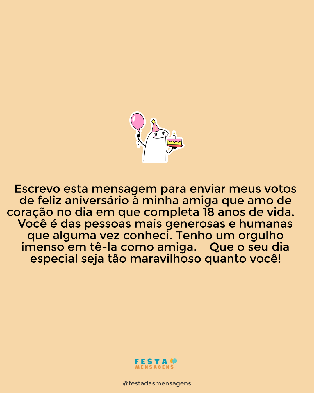 Parabéns, querida! Você é e será sempre a minha melhor amiga. É por isso que desejo que seu dia seja imensamente feliz junto das pessoas mais importantes da sua vida. Lute para conquistar todos os seus sonhos e lembre-se que estarei sempre ao seu lado para tudo. Na verdade, é só ao seu lado que me sinto em casa e feliz. Tenha um dia maravilhoso como você, querida! Beijo.