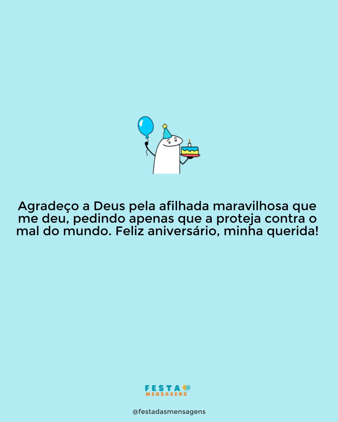 Feliz Aniversário! Tenho muito orgulho em seu seu padrinho. Ter um afilhado tão inteligente, tão capaz e tão humilde é uma dádiva para qualquer padrinho. Você é um adolescente muito especial – parece um adulto até. Isso me deixa muito feliz! Espero que você aproveite esta fase com toda a força, porque em breve surgem novas responsabilidades. Já não falta muito para sua maioridade! Bom, tenha um dia cheio de paz e de alegria e com alguma malandragem à mistura! Brincadeira. Parabéns, meu filho! Abraço.