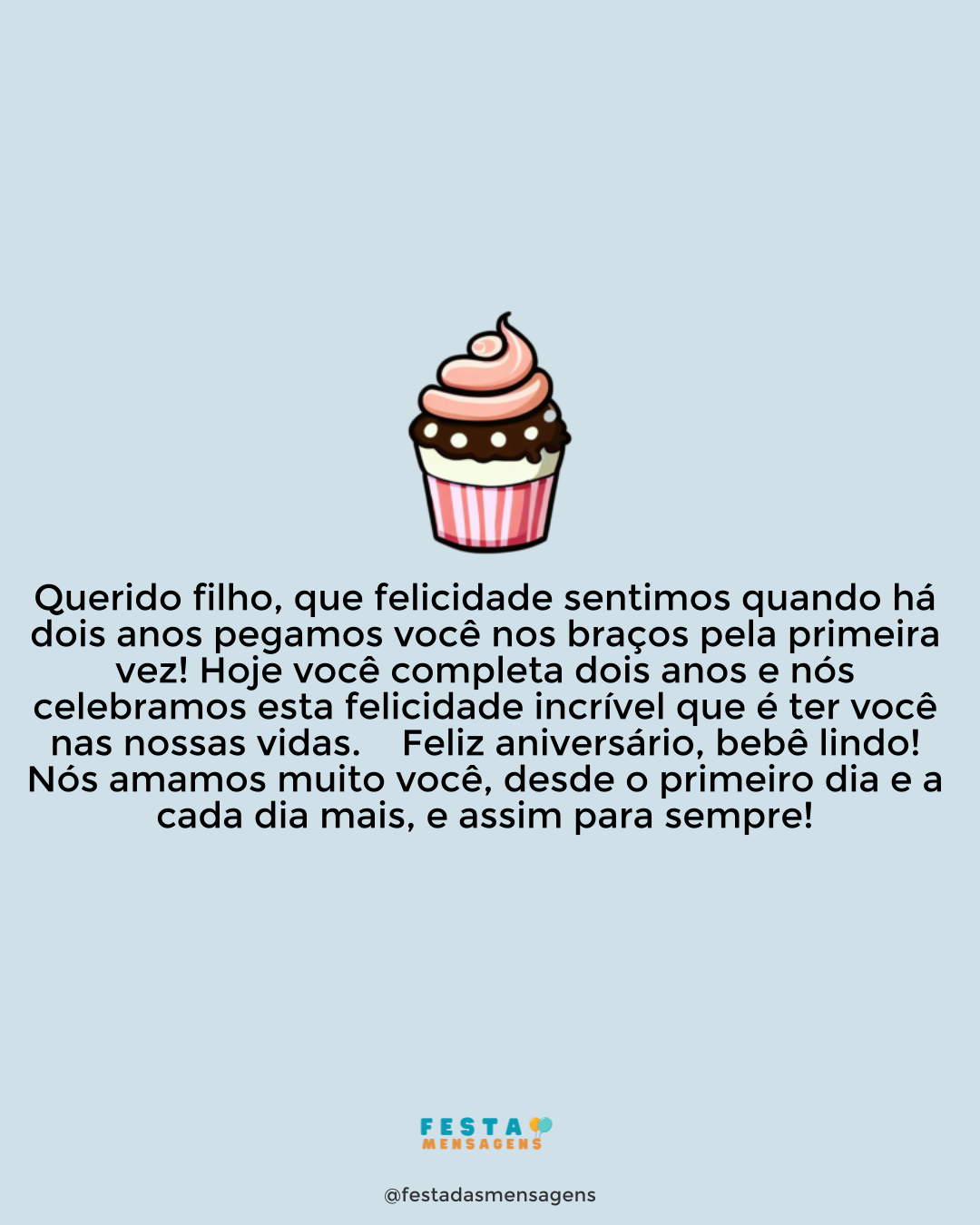 Que este seja um ano incrível, meu filho, porque você merece. Hoje, ao completar 14 anos, desejo que seu dia seja abençoado para que possa sorrir sempre. Você é um menino muito especial e eu me emociono muito em vê-lo crescer. Saiba que tenho muito orgulho do homem que você está se tornando. Nunca deixe que ninguém diga que você não pode fazer algo, pois é um menino batalhador e sempre irá conquistar seus sonhos. Siga vivendo, alegrando a todos ao redor e sendo exatamente quem é. Você é meu orgulho, filho! Tenha um aniversário extraordinário!