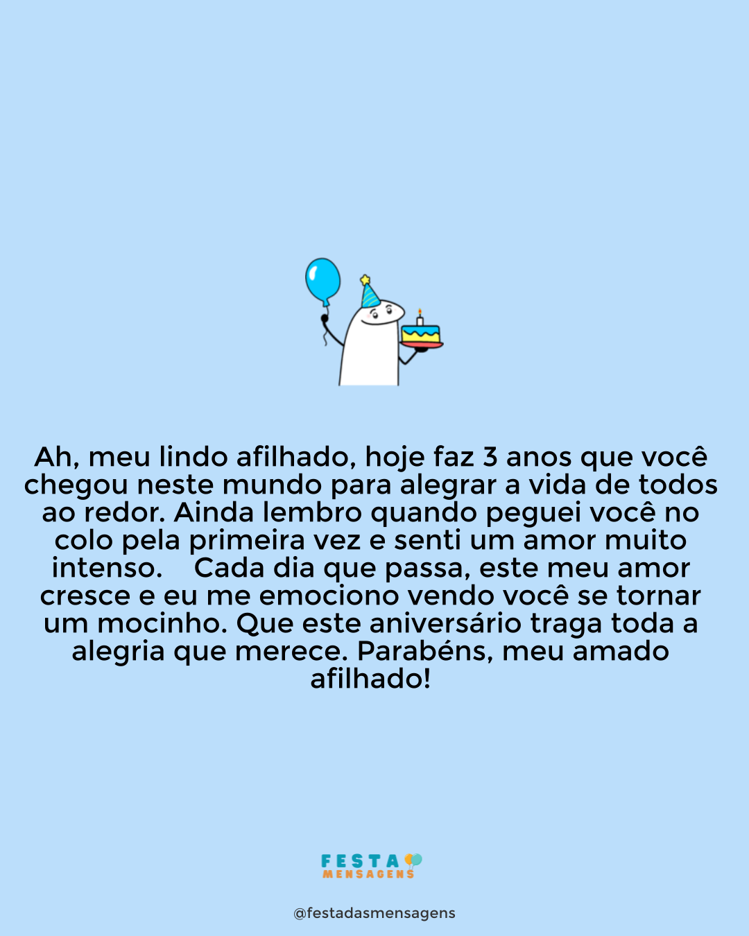 Que este seja um ano incrível, meu filho, porque você merece. Hoje, ao completar 14 anos, desejo que seu dia seja abençoado para que possa sorrir sempre. Você é um menino muito especial e eu me emociono muito em vê-lo crescer. Saiba que tenho muito orgulho do homem que você está se tornando. Nunca deixe que ninguém diga que você não pode fazer algo, pois é um menino batalhador e sempre irá conquistar seus sonhos. Siga vivendo, alegrando a todos ao redor e sendo exatamente quem é. Você é meu orgulho, filho! Tenha um aniversário extraordinário!
