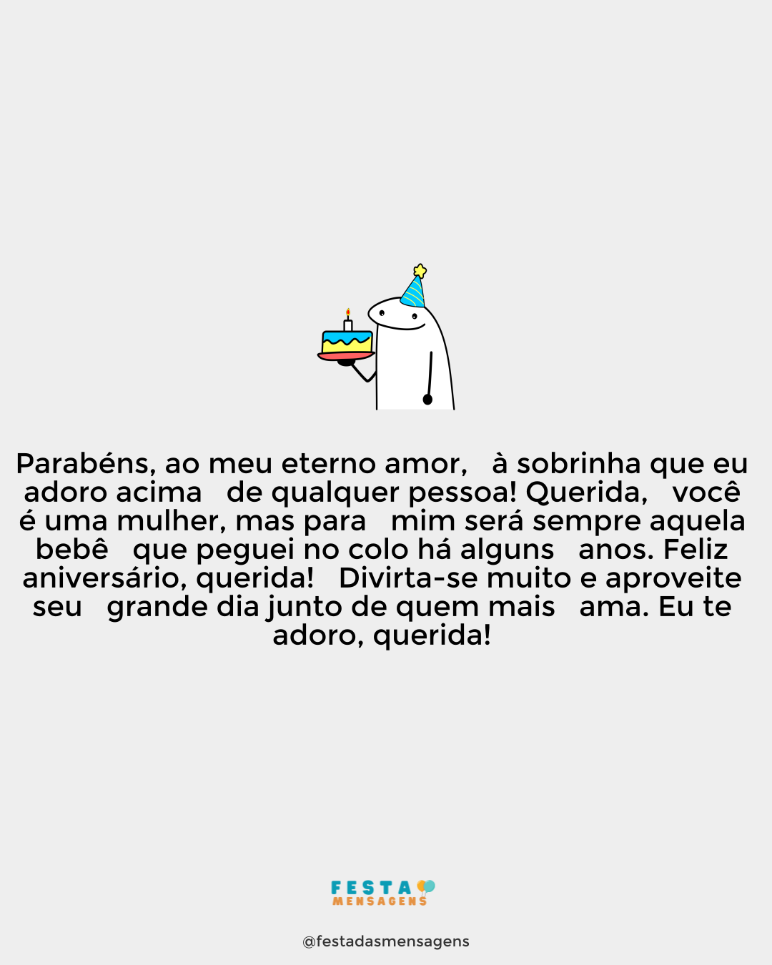 Seja muito feliz, hoje e sempre, e nunca desista dos seus sonhos. Eu estarei sempre perto para garantir que na sua vida tudo dá certo. Parabéns, filha de coração, por mais um ano cheio de coisas boas!